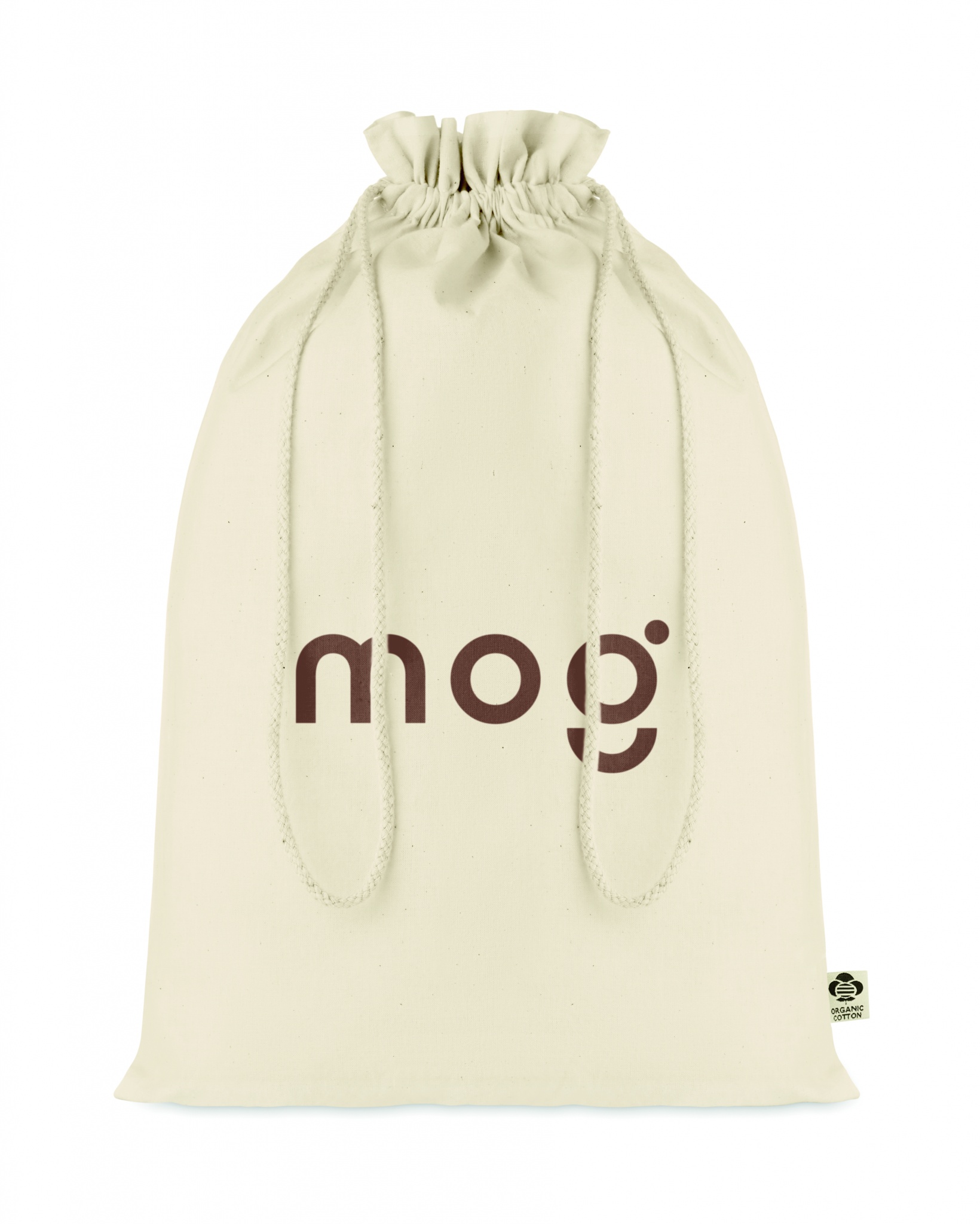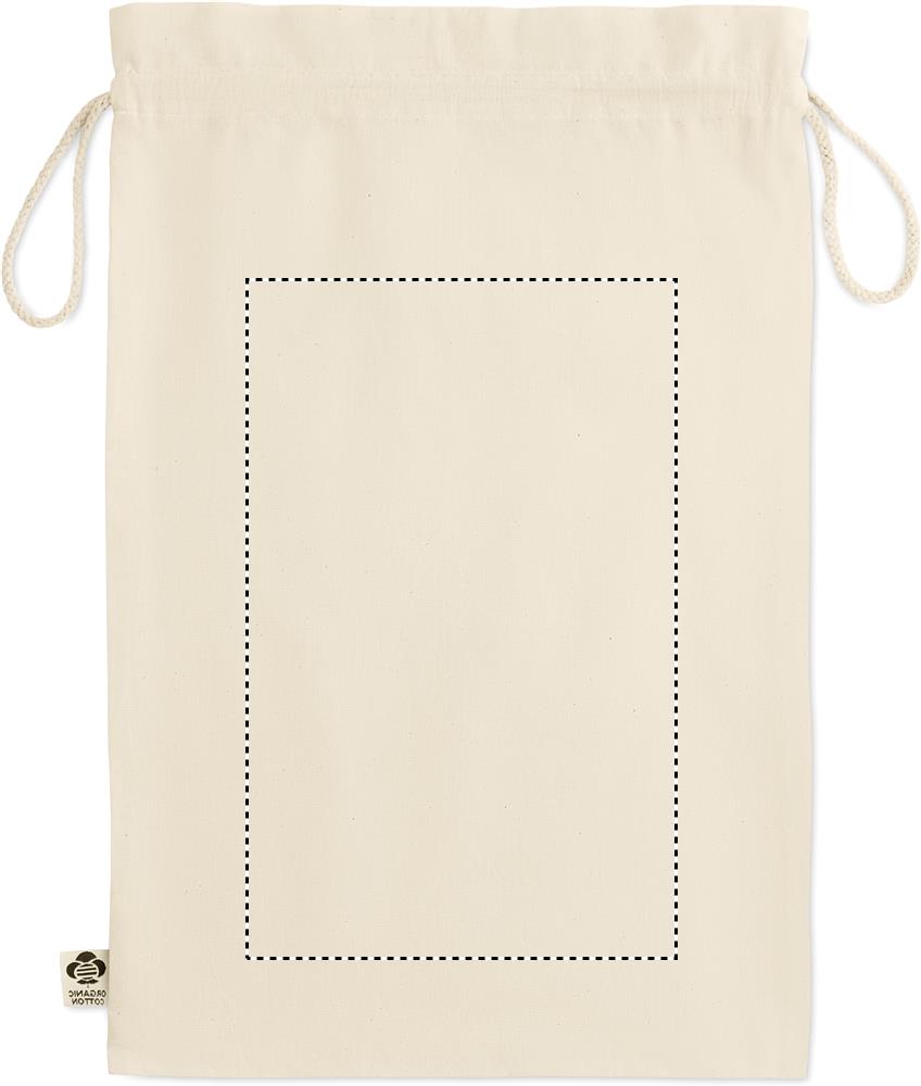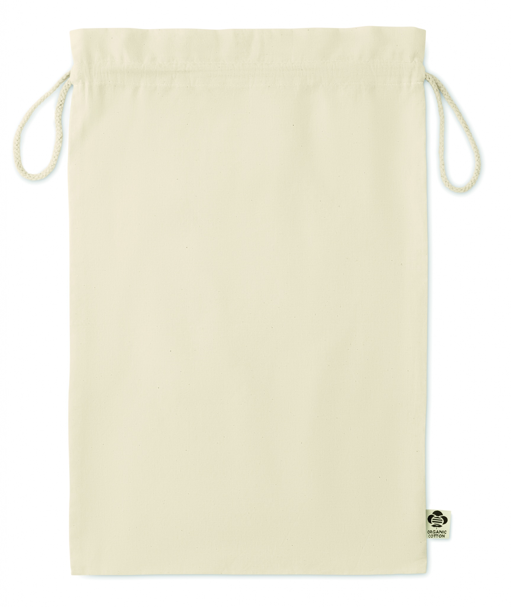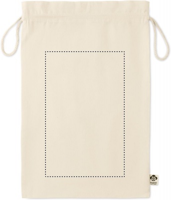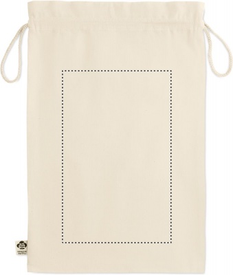 105 gr/m² suuri orgaanisesta puuvillas valmistettu pussi, kiristysnauhalla.