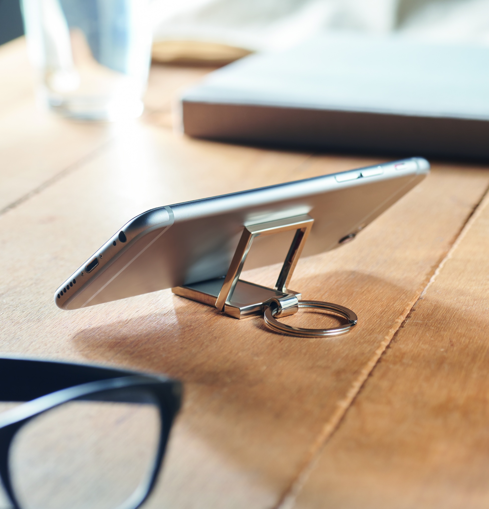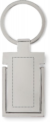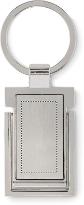 Metallinen avaimenperä joka toimii myös puhelintelineenä.