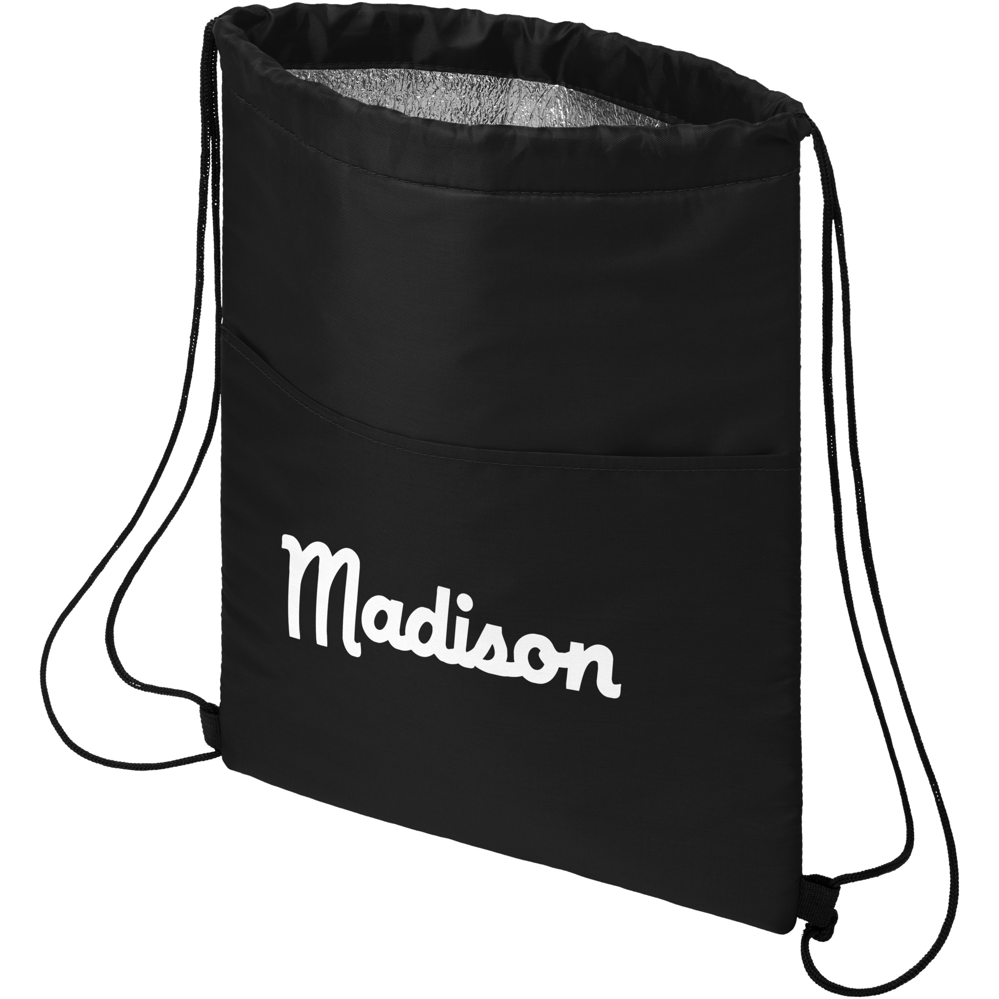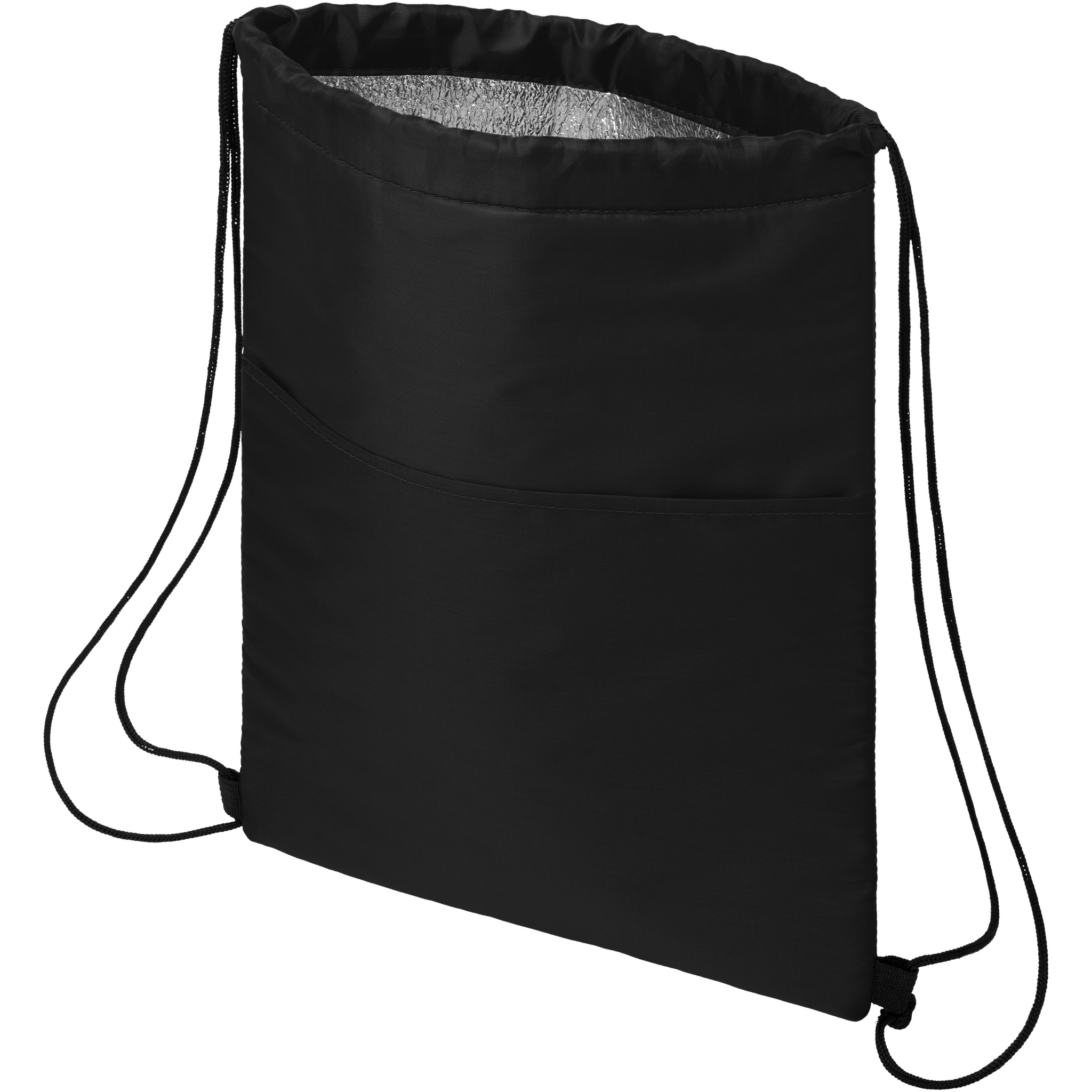 Kiristysnyörillinen jäähdytinlaukku, jossa mustat suljinnauhat. Avoin etutasku. Sopii 12 tölkille. Kestää jopa 5 kg painon.