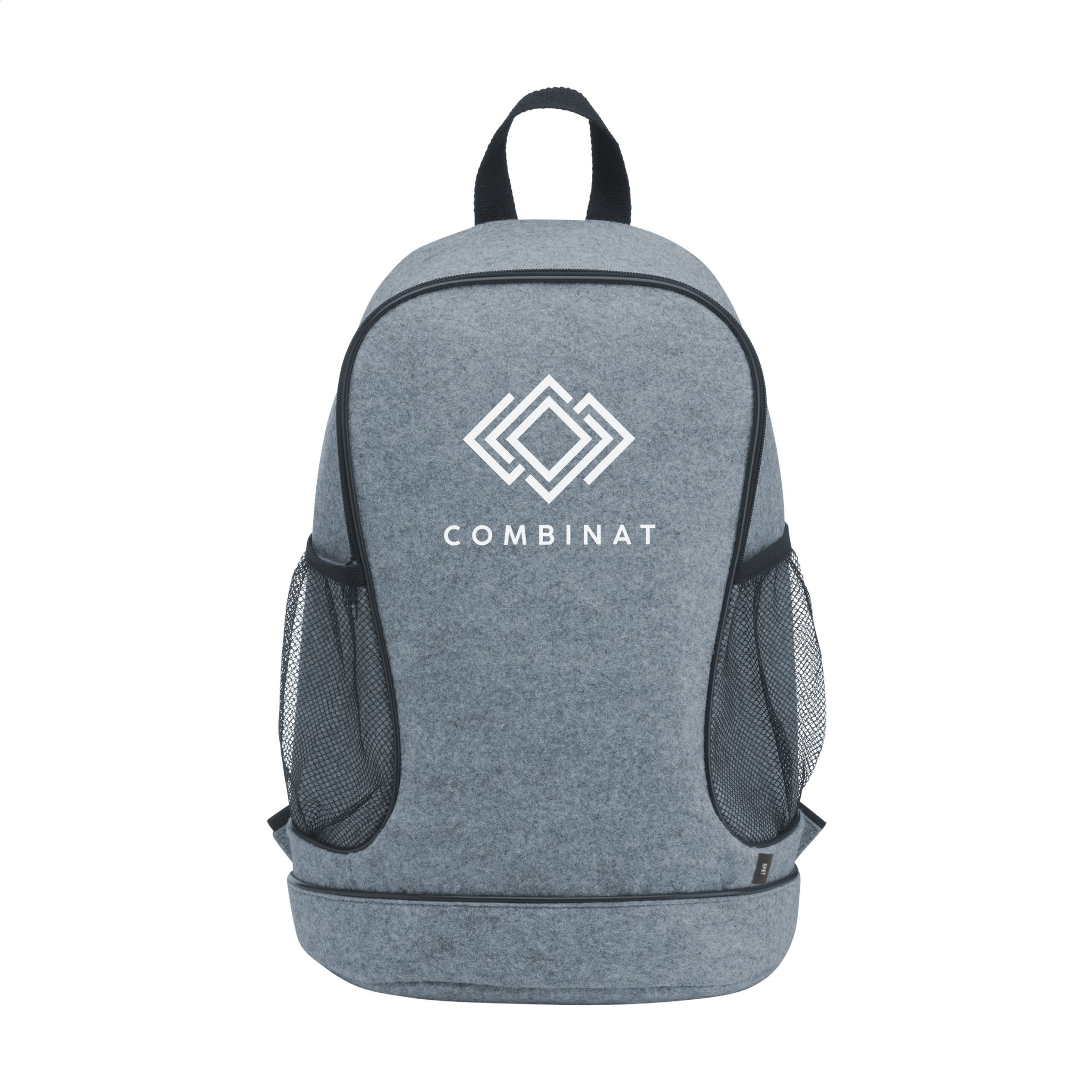 Vau! Kestävä, käytännöllinen reppu tukevasta RPET-huovasta (valmistettu kierrätetyistä PET-pulloista). Ominaisuuksiin kuuluu tilava päälokero ja käytännölliset verkkosivutaskut sekä säädettävät ja pehmustetut olkaimet. Laukussa on pehmustettu takaosa lisää mukavuutta ja kätevä kantolenkki. Kapasiteetti n. 22 litraa.