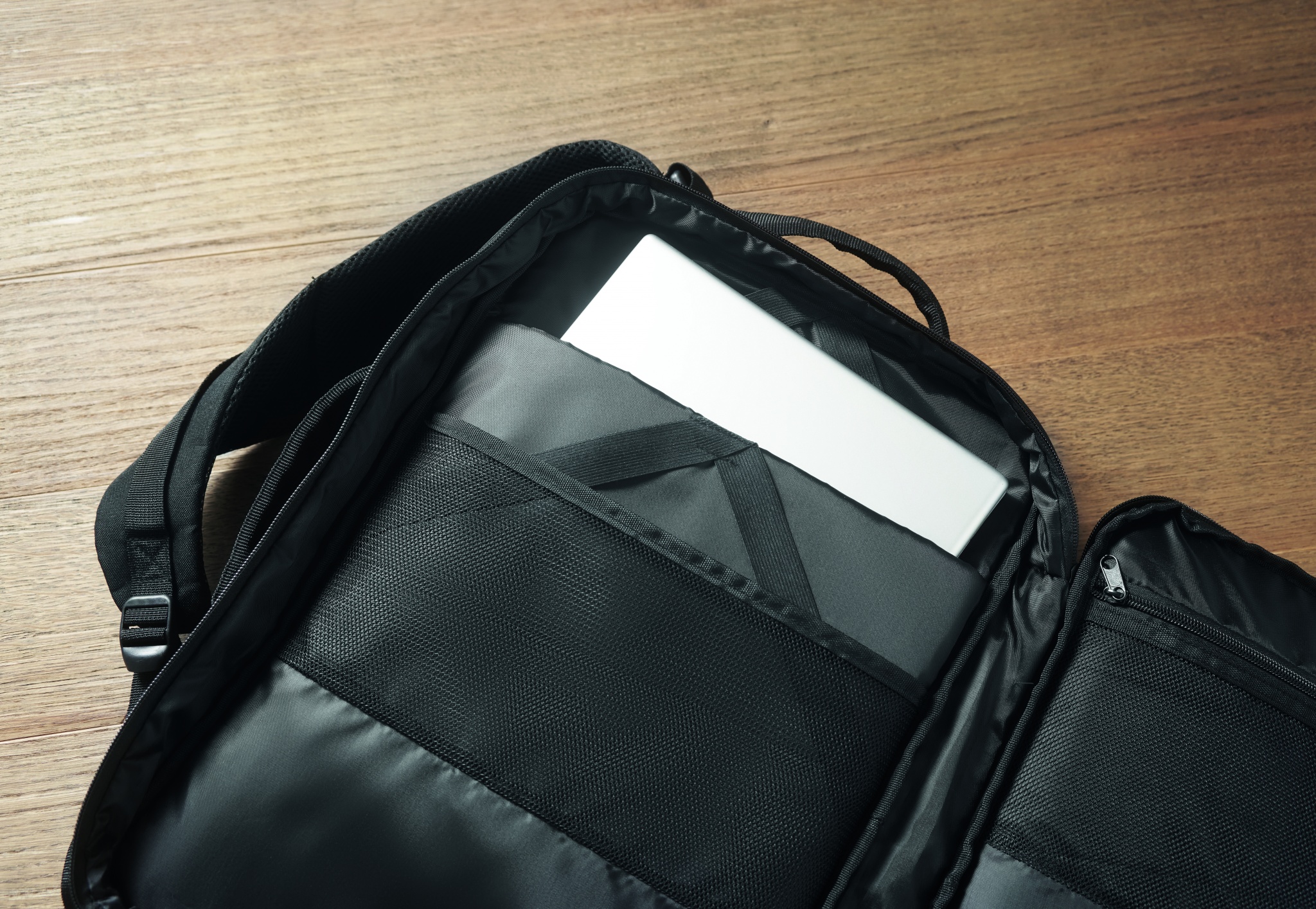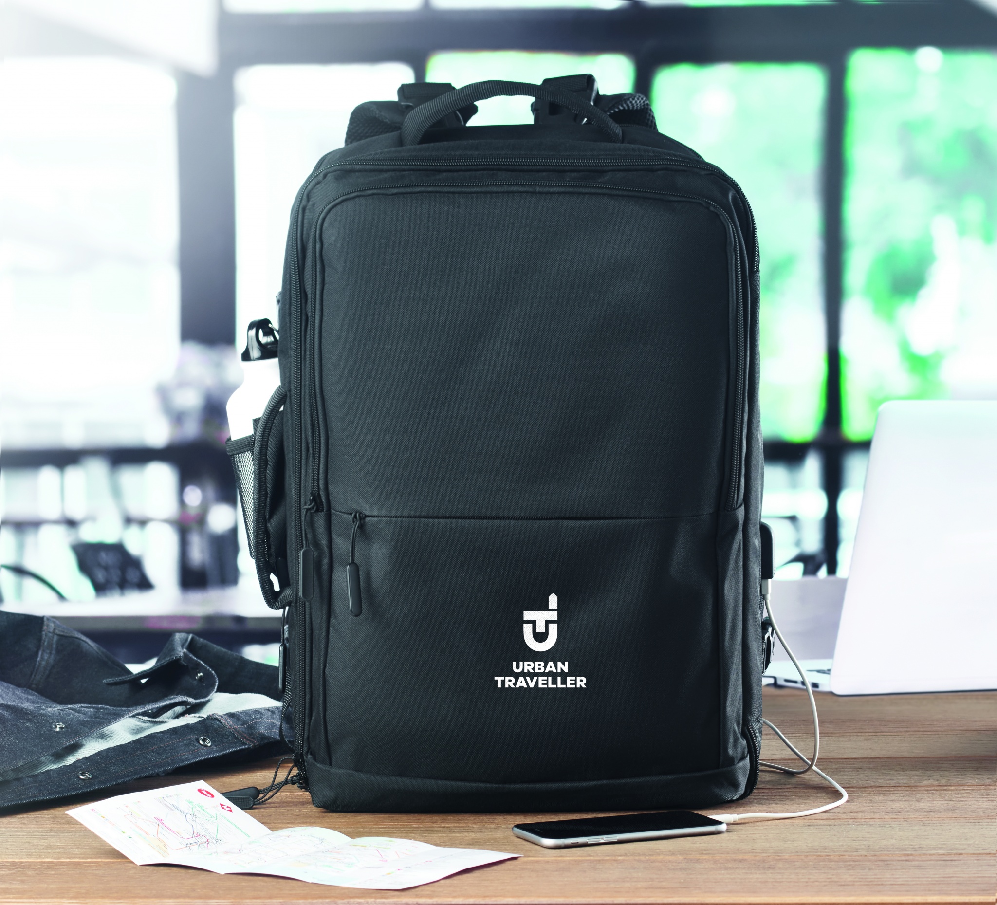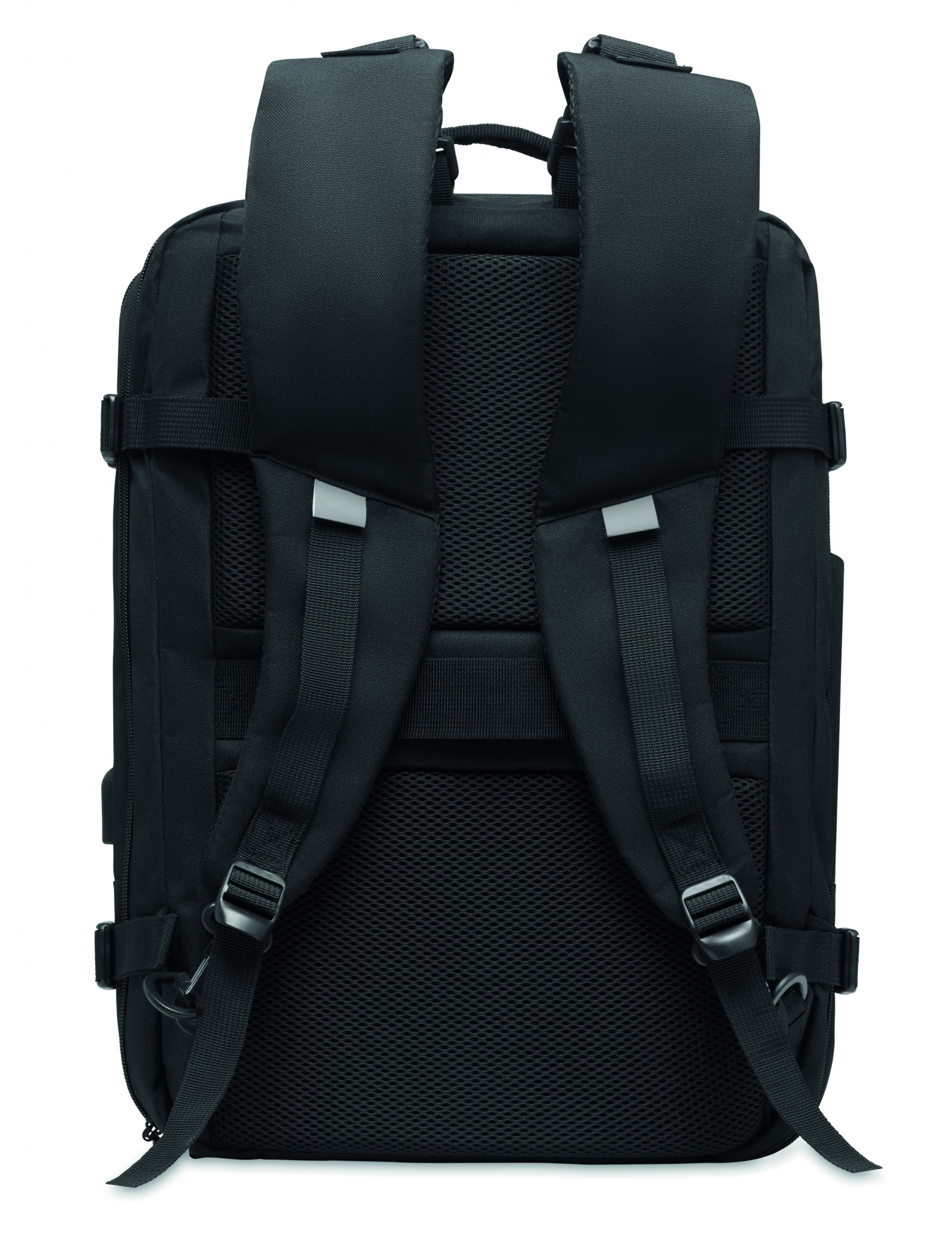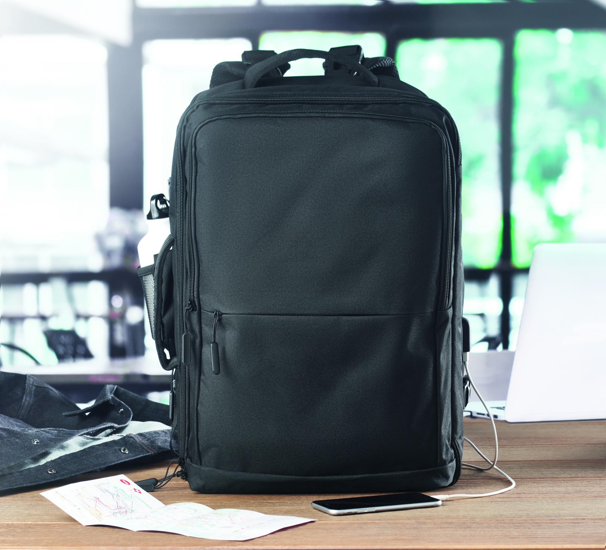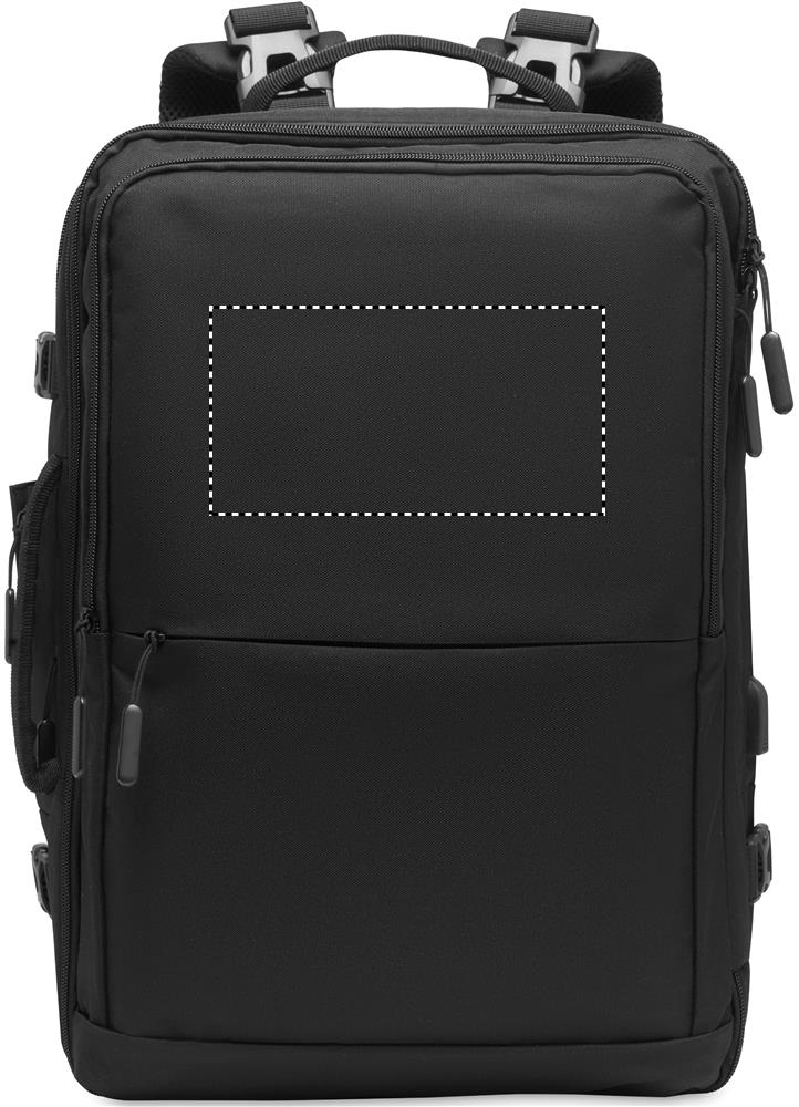 Travel Tech -reppu 600D RPET-polyesteriä. Repussa on useita lokeroita ja taskuja.
