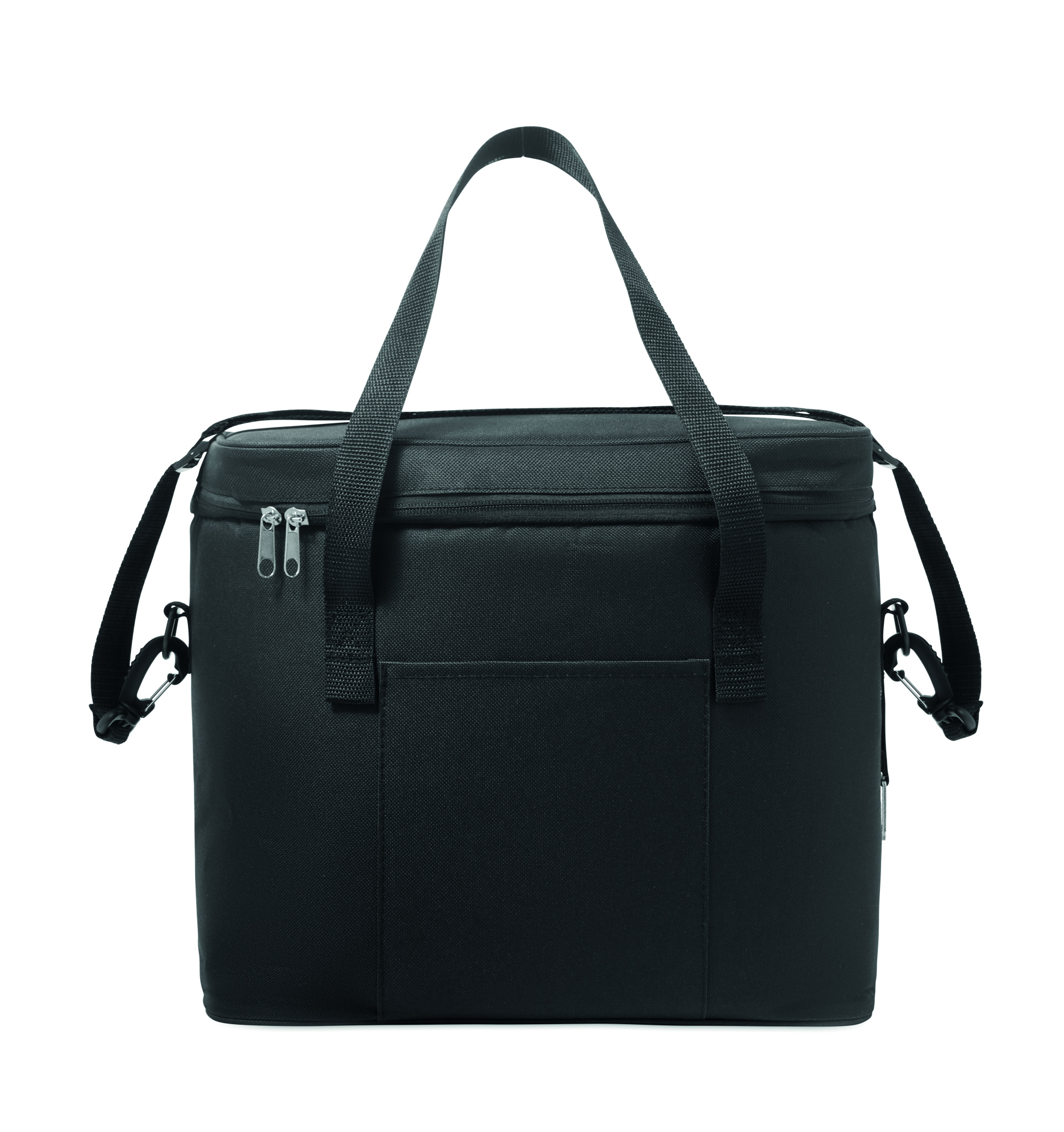 Kylmälaukku 600D RPET-polyesteriä PU-pinnoitteella. Mukana yksi etutasku ja yksi sisäinen verkkotasku. Eristävä PEVA-vuori 6 mm:n PE-vaahtomuovilla. Kaksi kantokahvaa ja yksi säädettävä olkahihna.