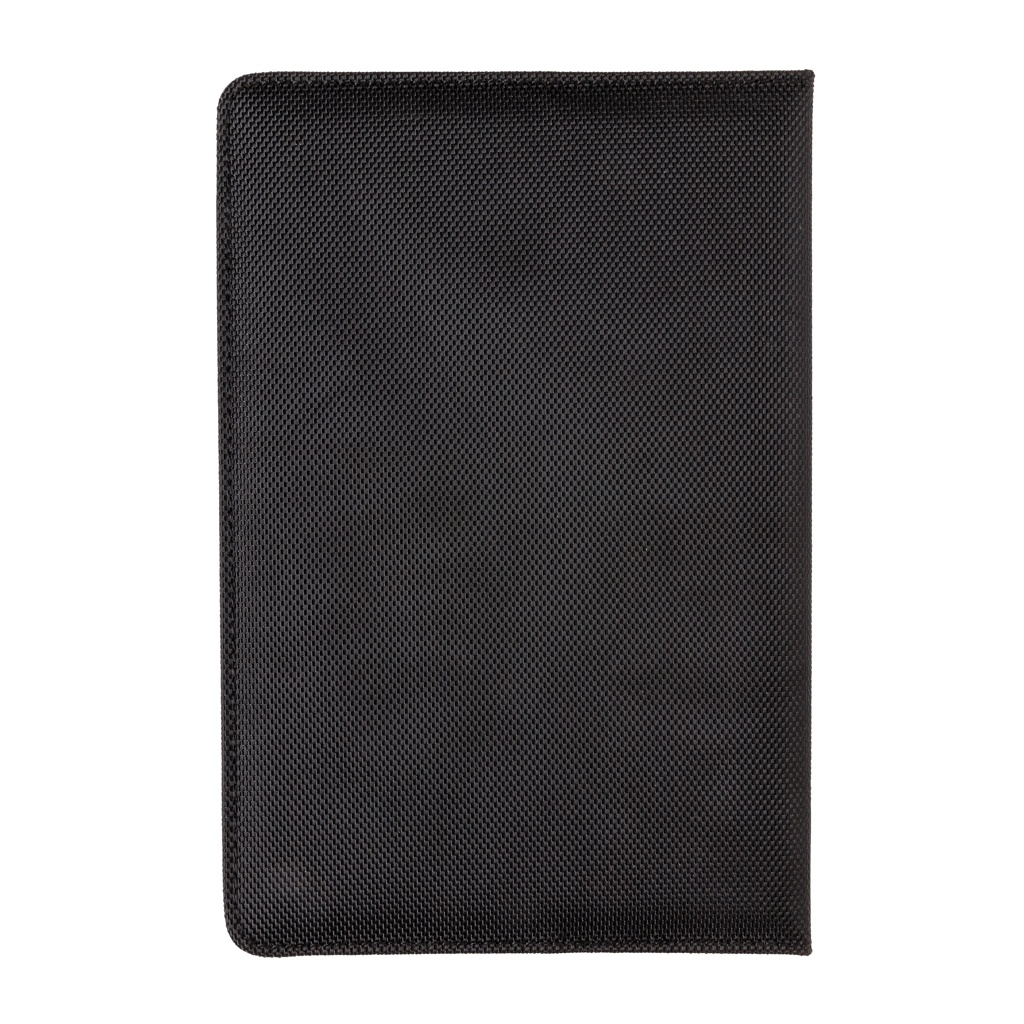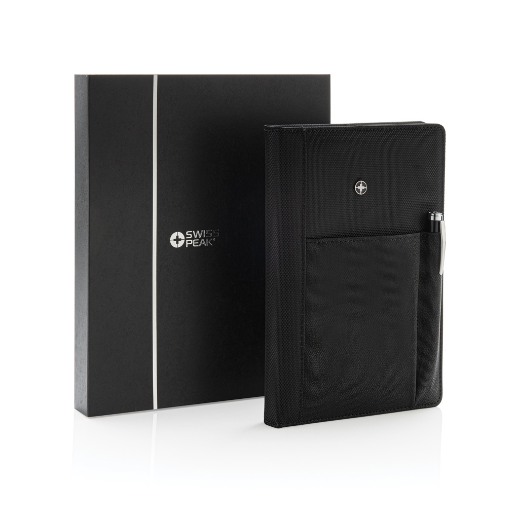 1680D and 600D polyesteri muistikirjan kannet ja kynä. Sisältää irrotettavan muistilehtiön 192 sivulla 80g/m2. Kannen taskuun voidaan asettaa kynä, kortteja, käteistä, puhelin ym. Pakattu Swiss Peak lahjapakkaukseen.