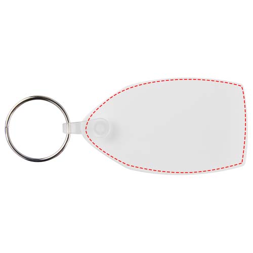 Valkoinen suorakaiteen muotoinen avaimenperä, jossa on metallinen avainrengas. Metallirengas tekee profiilista litteän, mikä on ihanteellista postituksen kannalta.
