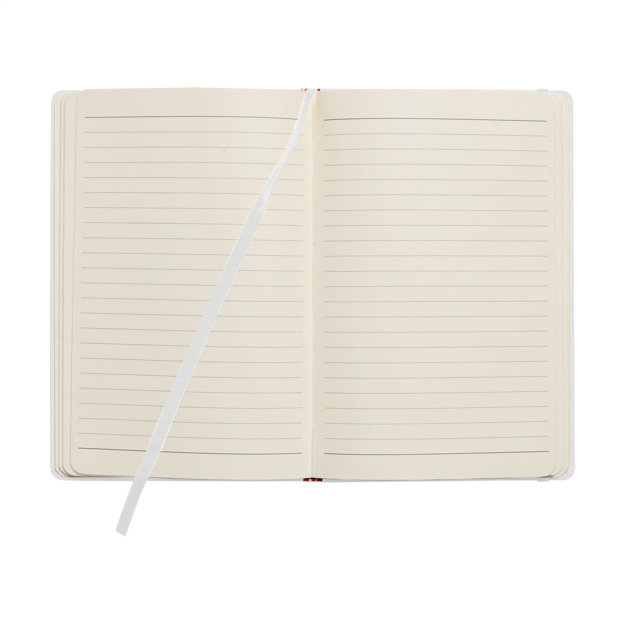 A5-kokoinen muistikirja, jossa n. 96 arkkia/192 sivua kermanväristä, vuorattua paperia (80 g/m²). Täydellinen sidonta, kova kansi, tasku, joustava kiinnitys ja silkkinauha.