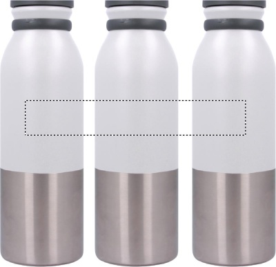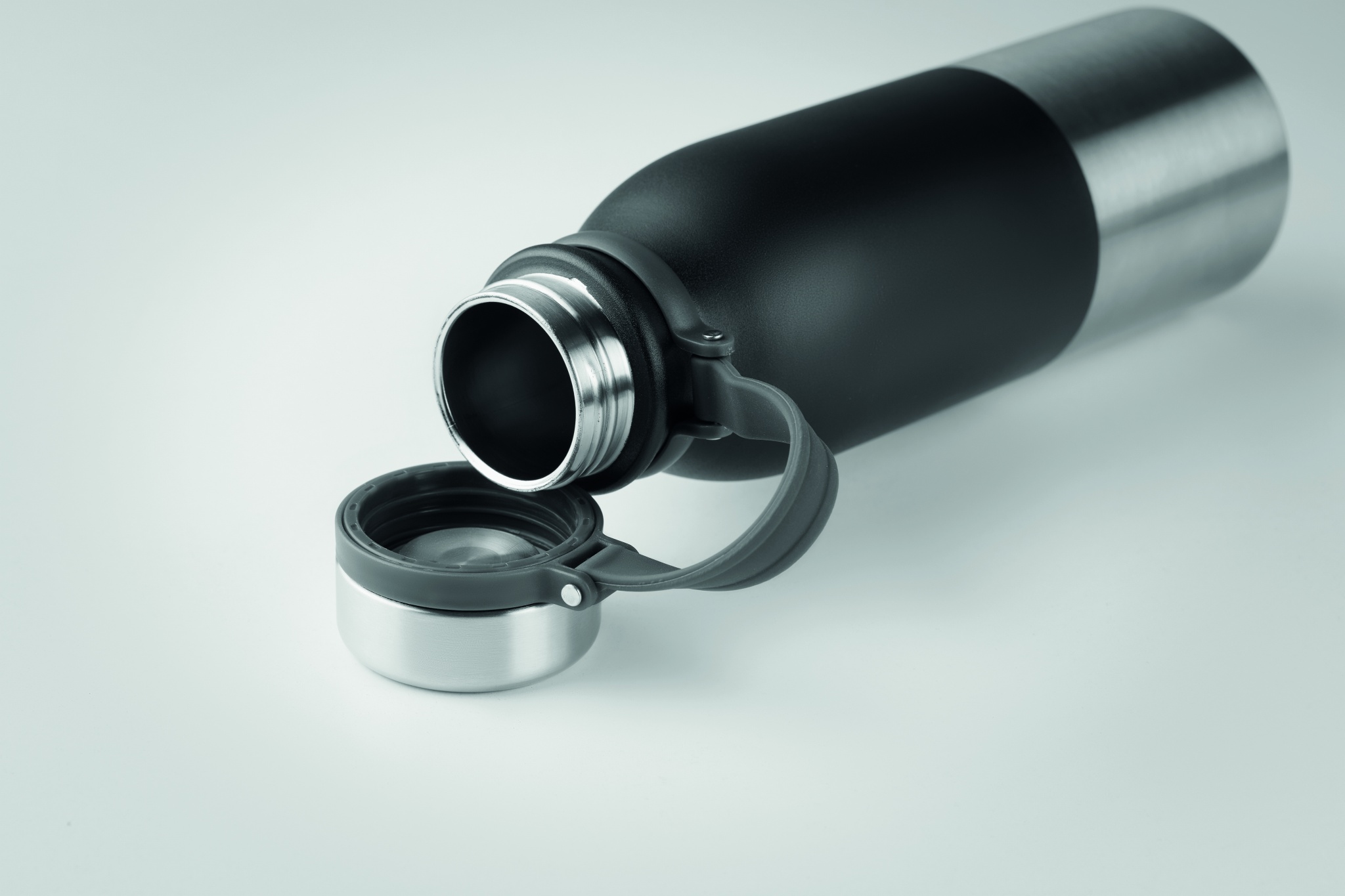 Kaksiseinäinen ruostumattomasta teräksestä valmistettu 600 ml pulverimaalattu termospullo silikonilenkillä, helpottamaan tuotteen kantamista. Tuote on vuoto vapaa.