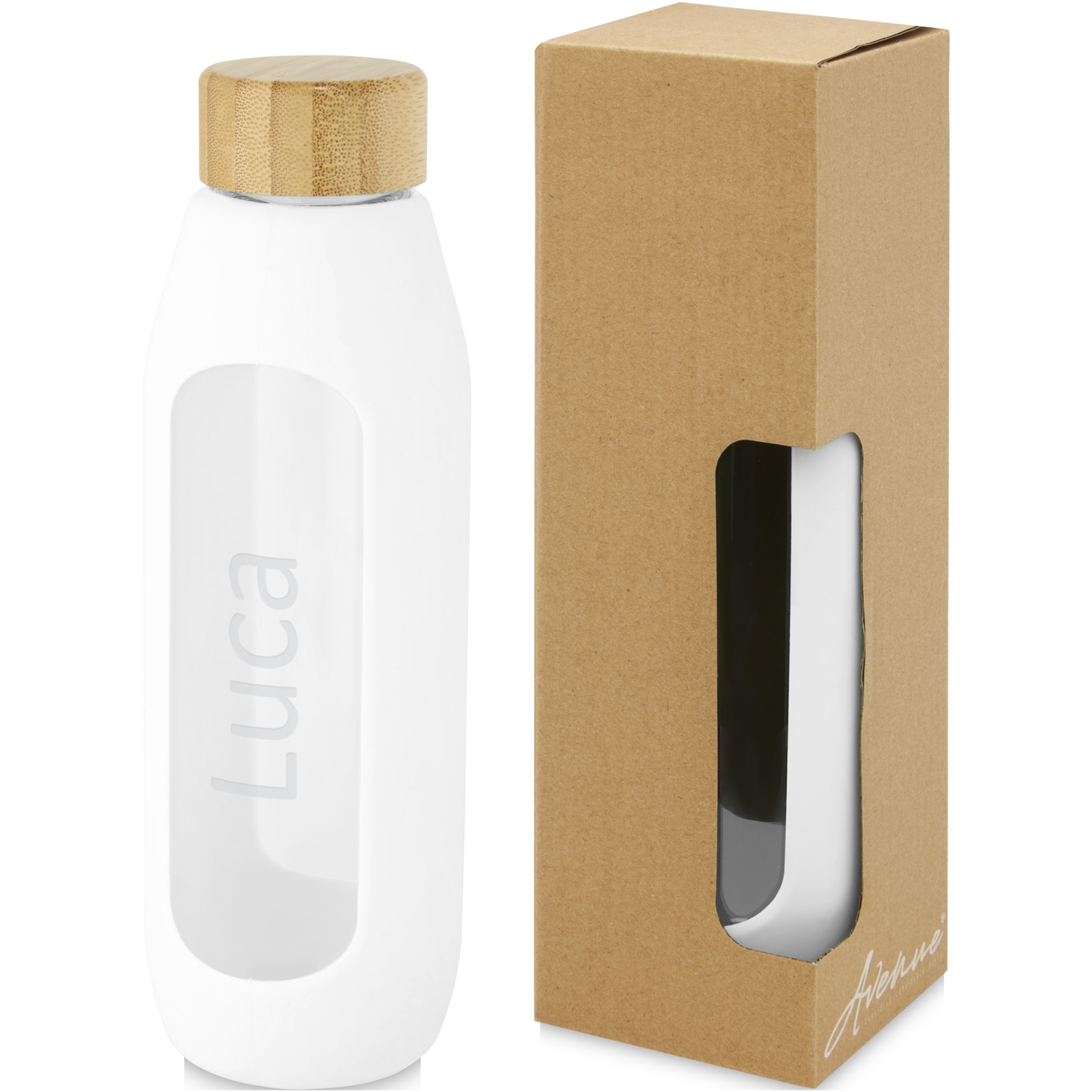 Ympäristöystävällinen vesipullo. Pullo on valmistettu kestävästä borosilikaattilasista, joka säilyttää puhtaan raikkaan veden maun, eikä se sisällä haitallisia kemikaaleja. Sisältää silikonisuojuksen ja vuotamattoman kannen, joka on valmistettu orgaanisesta bambusta. Testattu ja hyväksytty elintarviketurvallisuslainsäädännön (LFGB) mukaisesti, ja ftalaattipitoisuus on testattu REACH-asetusten mukaisesti. Tilavuus on 600 ml. Suojuksen ja kannen irrotuksen jälkeen kestää pullo konepesun. Toimitetaan kierrätetystä kartongista valmistetussa lahjapakkauksessa.
