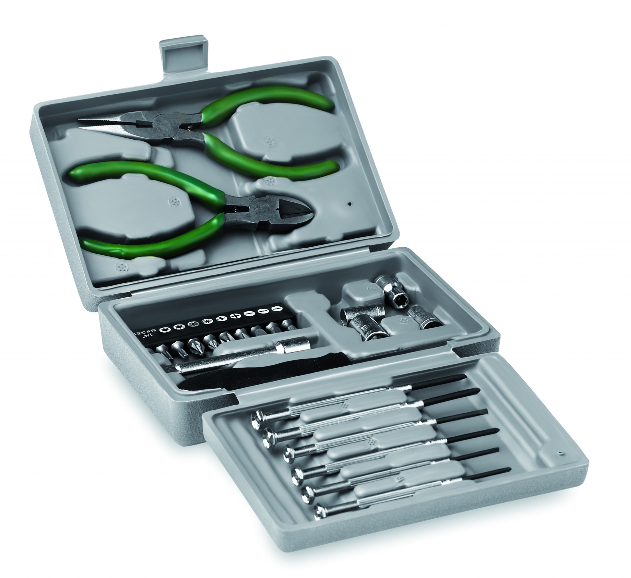 Taitettava 25-osainen työkalusarja. Sisältää pinsetit, 6 kpl ruuvimeisseleitä, jatkeen, 4 kpl hylsysarjan, litteäpihdit, leikkauspihdit ja 10 kpl bittisetin. Pakattuna muoviseen säilytyslaatikkoon.