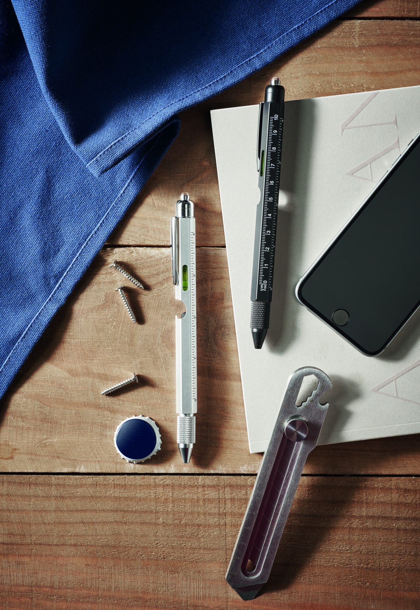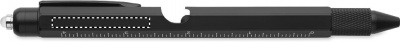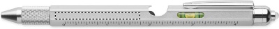 Ruostumattomasta teräksestä valmistettu kierrettävä vesivaakakynä, jossa on viivoitin, kynän ja Phillips- ja litteäpäiset ruuvimeisselit sekä LED. Mukana 3 AG-paristoa. Sininen muste.