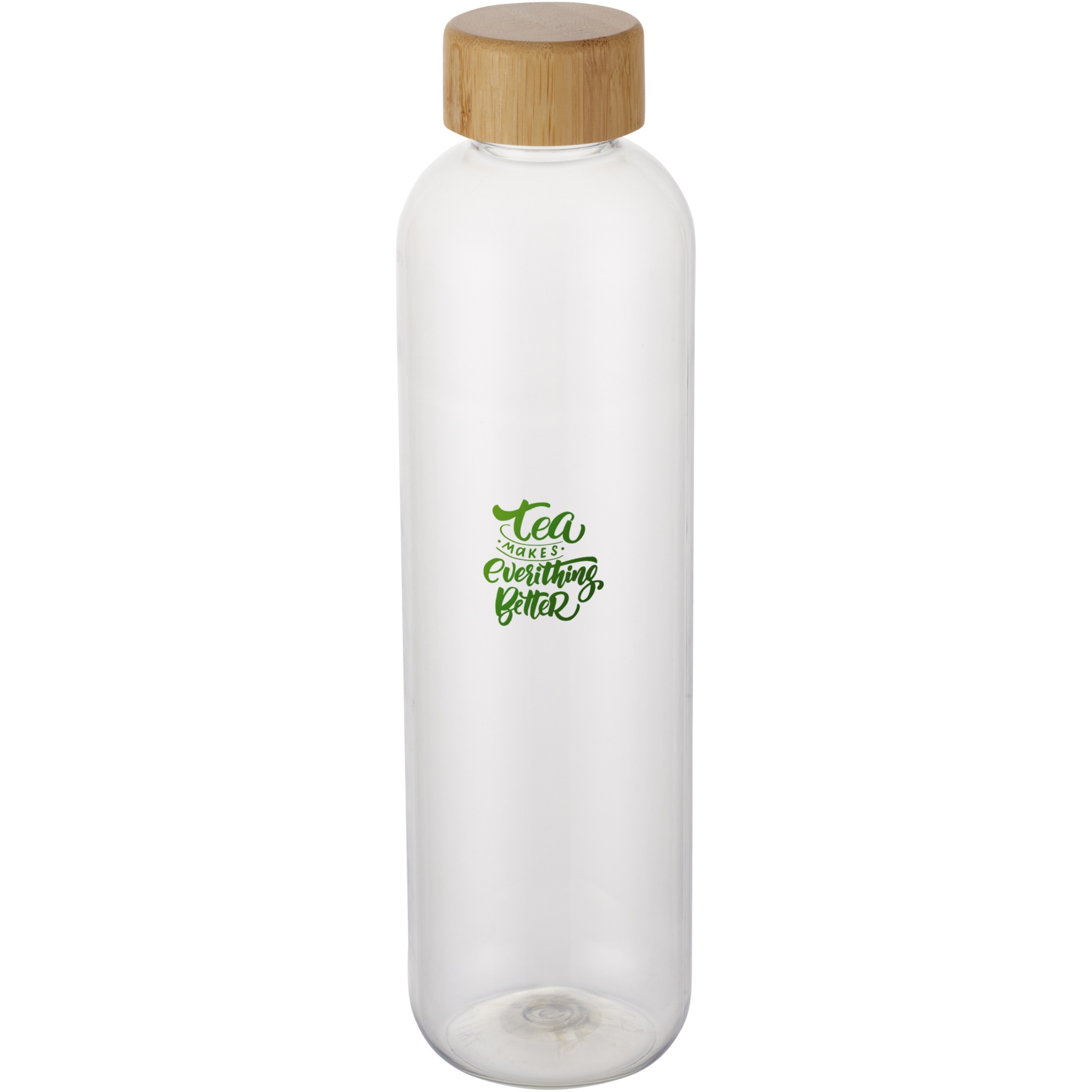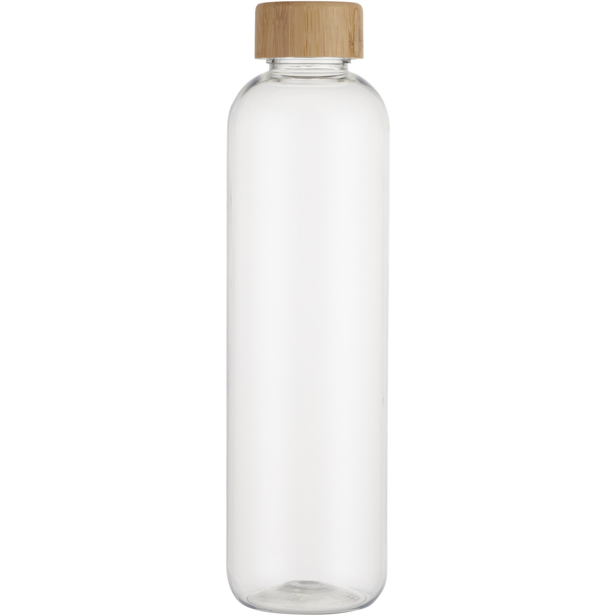Kierrätysmuovista valmistettu uudelleenkäytettävä vesipullo, jossa on tyylikäs bambukansi. Yksiseinäinen pullo on BPA-vapaa, testattu ja hyväksytty Saksan elintarviketurvallisuuslainsäädännön (LFGB) mukaisesti. Testattu ja hyväksytty ftalaattipitoisuuden suhteen REACH-määräysten mukaisesti. Bambu on peräisin luontoa säästävistä, sosiaalisesti ja ympäristön kannalta vastuullisista lähteistä. Tilavuus on 950 ml. Suositellaan pestäväksi käsin. Toimitetaan kierrätetystä kartongista valmistetussa lahjapakkauksessa.