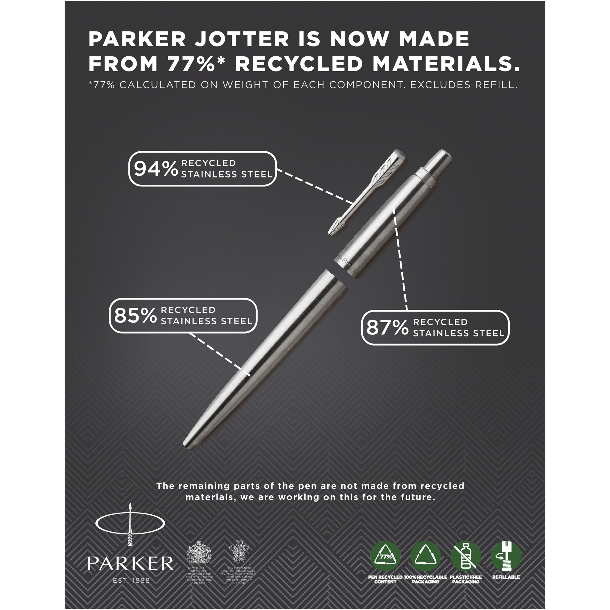 Jotter yra autentiška pastarųjų 60 metų dizaino ikona. Su geidžiamomis spalvomis ir išskirtine forma Jotter išlieka populiariausiu Parker rašikliu, atpažįstamu nuo jo spragtelėjimo. Įsk. Parker dovanų dėžutė. Pristatomas su patentuotu QuinkFlow rutuliniu užpildu. Išskirtinis dizainas.