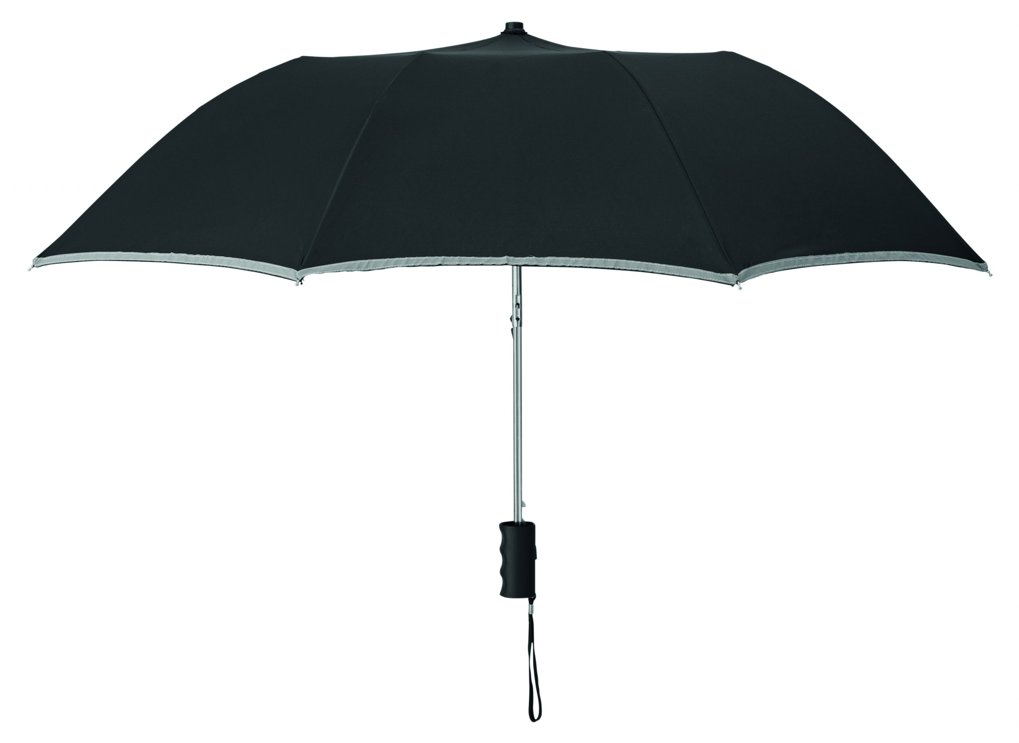 21 collu 2 reizes automātiski atverams lietussargs 190T pongejā ar cinkotu tērauda vārpstu, ribām un uzgaļiem. Paneļi ar atstarojošu apdari. Melns plastmasas rokturis ar rokas siksnu. Iekļauts atbilstošs maisiņš ar atstarojošiem apdari. Manuāla aizvēršana.