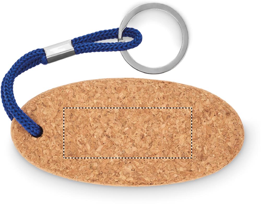 Ovāls peldošs korķa atslēgu piekariņš ar pītu virvi. Korķis ir dabisks materiāls, tā strukturālās īpašības un virsmas porainības dēļ gala izdrukas rezultātam uz vienu vienību var būt novirzes.