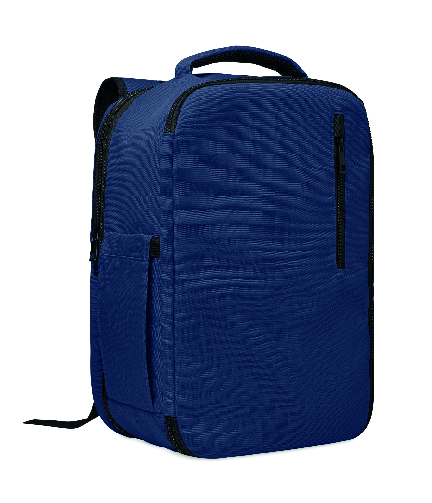 "Kajītes izmēra rokas bagāžas mugursoma, izvelkama no 600D RPET poliestera, ar 180o atvērumu. Aprīkota ar galveno nodalījumu ar divām atvērtām sekcijām, sieta nodalījumu, polsterētu 15 collu klēpjdatora kabatu un bagāžas siksnu."