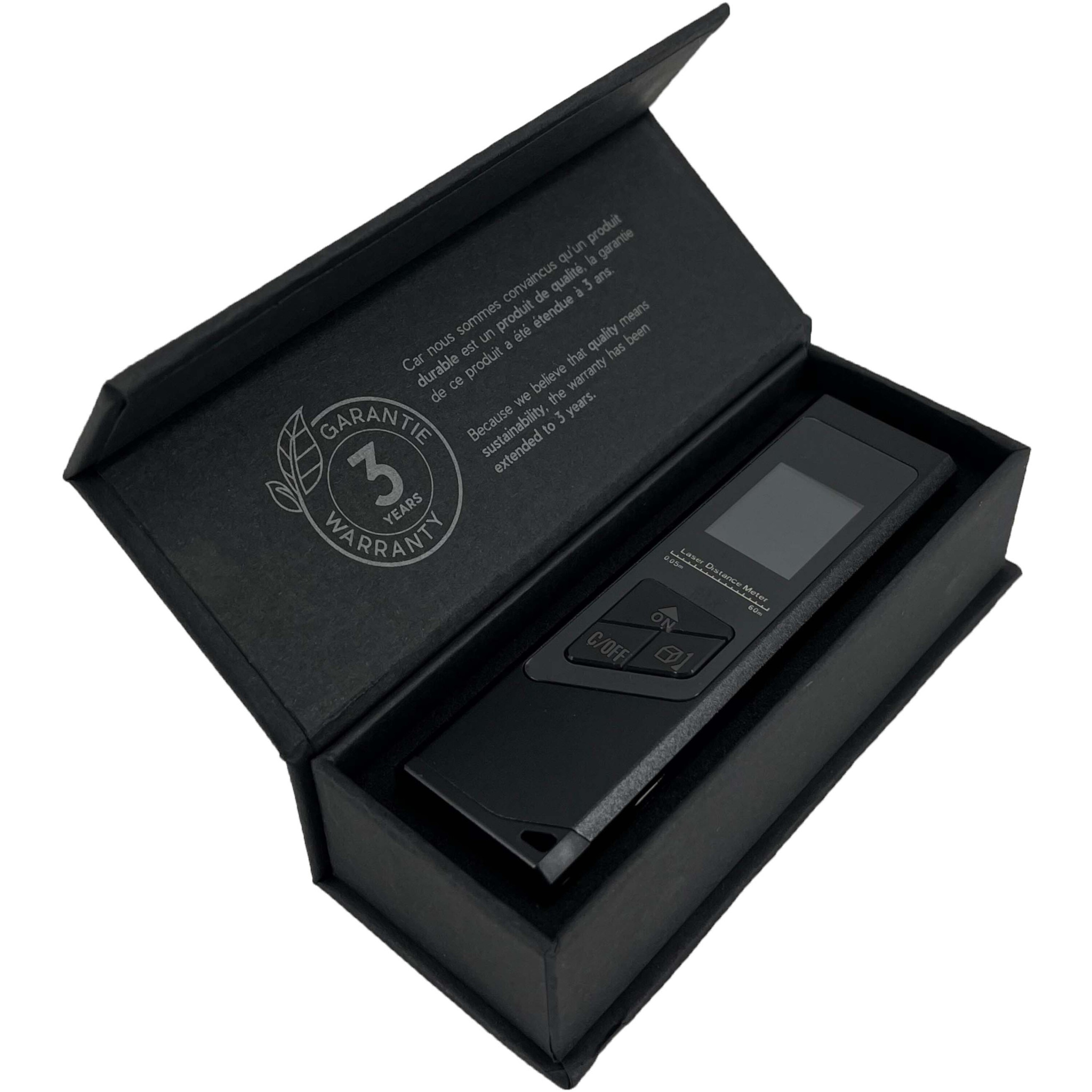Mini lāzera telemetrs ir vienkāršāks, ātrāks un precīzāks veids, kā izmērīt laukumu, tilpumu, un tam ir arī Pitagora funkcija. Pateicoties lāzera precizitātes tehnoloģijai un reāllaika mērīšanas režīmam, tas nodrošina uzticamus mērījumus līdz pat 40 metriem. Telemetrs izmanto enerģiju taupošu 200 mAh litija jonu akumulatoru kā barošanas avotu, un pēc pilnīgas uzlādes var izmērīt attālumu 2000 reizes. Tam ir aizmugurgaismots displejs, kas ļauj ērti skatīt pat tumšās vietās. Izmērs: 9 x 2,4 x 1,1 cm. Iepakots pārstrādāta papīra dāvanu kastītē (10,2 x 4,2 x 3 cm) ar magnētisku aizdari. Ietver 3 gadu garantiju.
