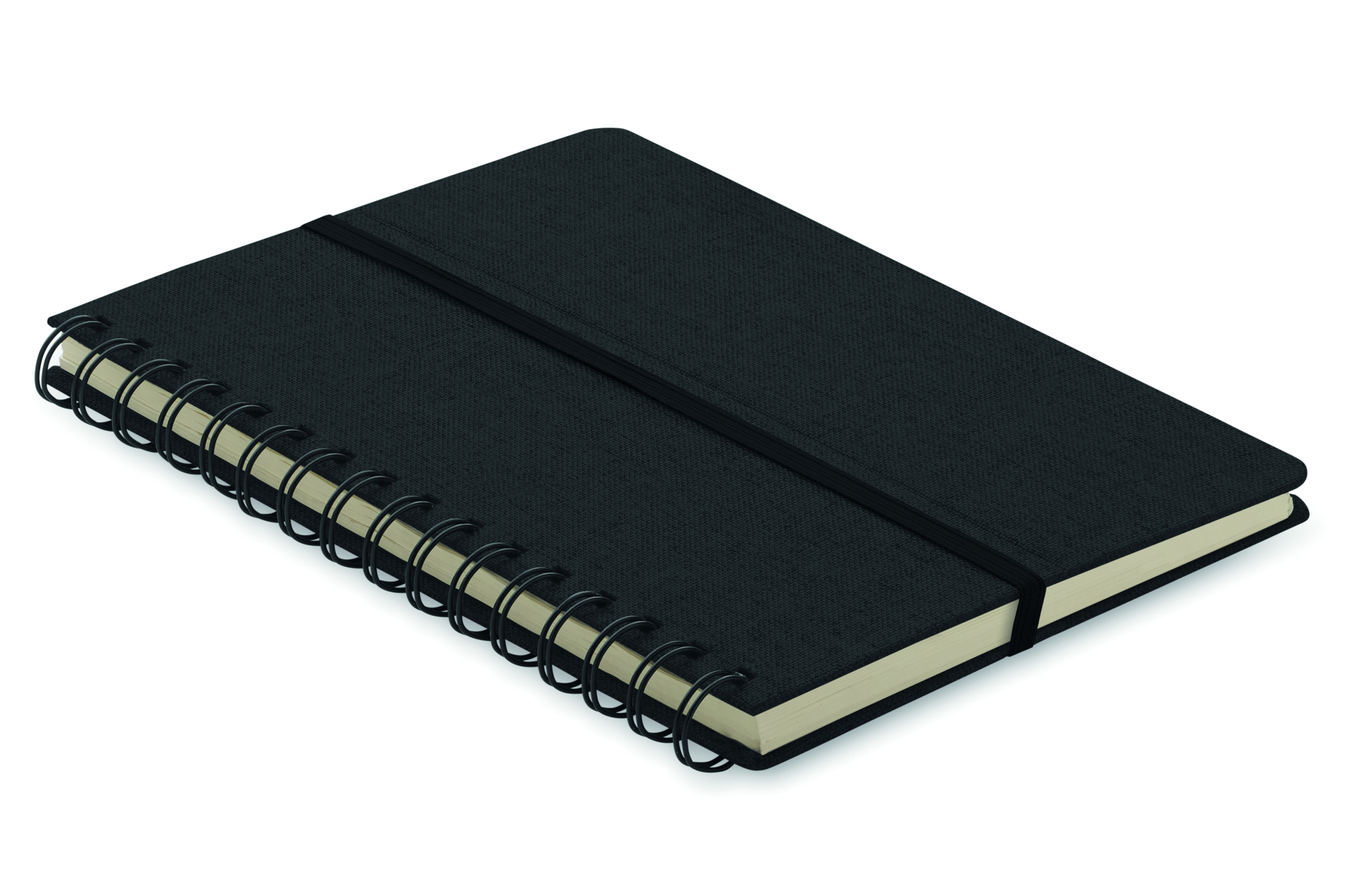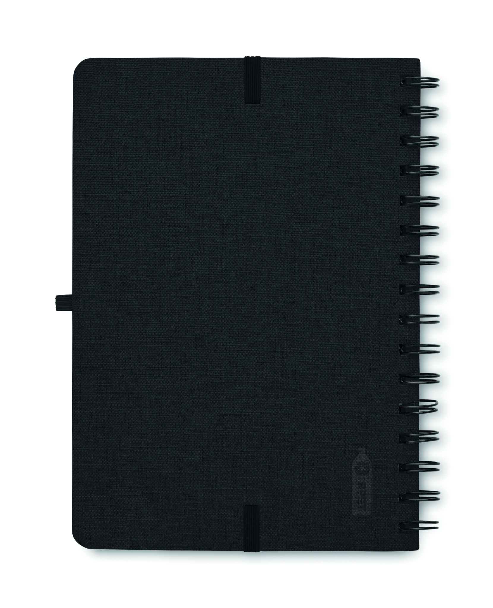 A5 notebook with 600D RPET hard cover with smartphone stand function. Twin-wire. 160 lined pages (80 sheets). 70 gsm recycled paper. Elastic closure strap.