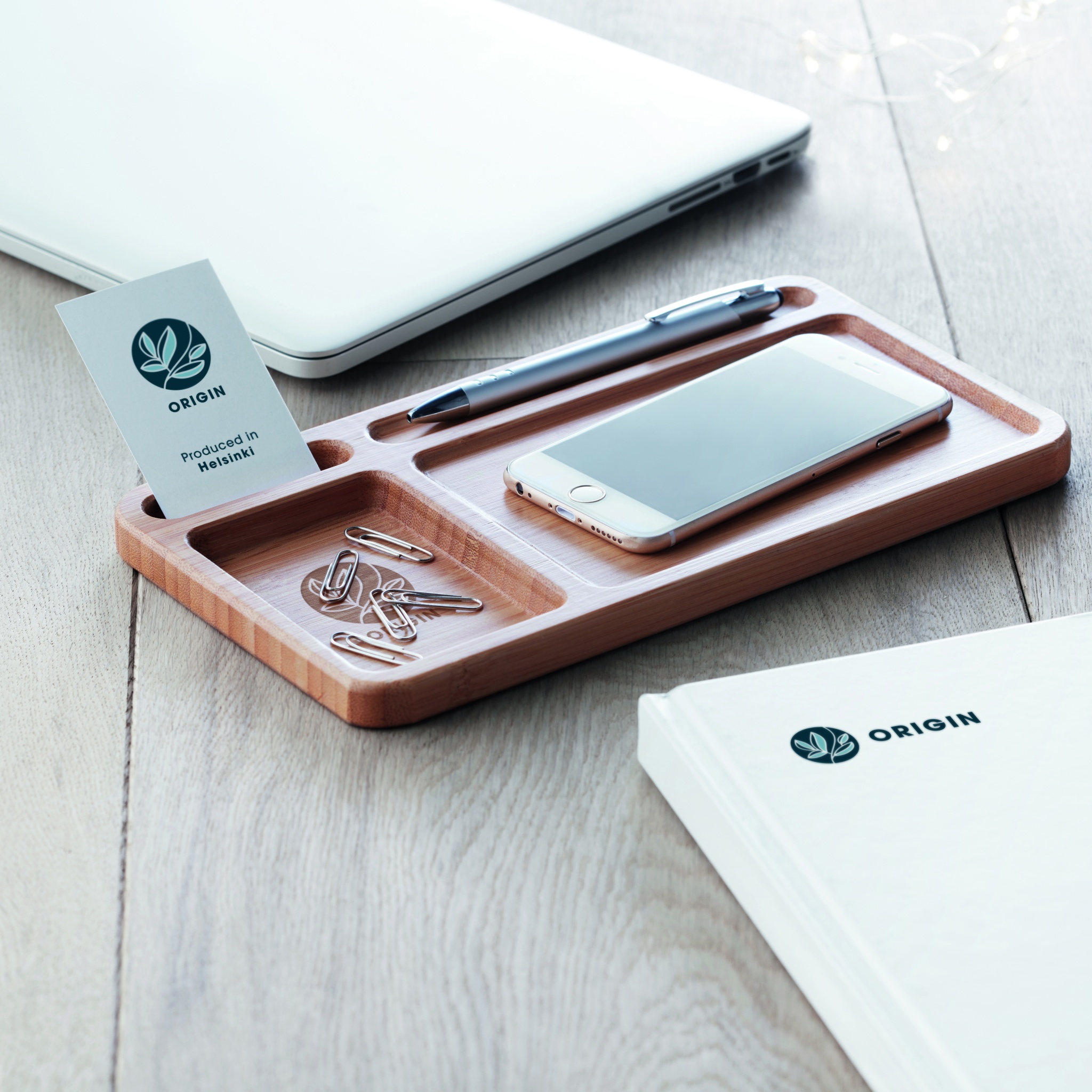 Настольный органайзер из бамбука с беспроводным зарядным устройством. Включает 80см USB-кабель. Выход DC5V/1A (5W). Совместимость со всеми устройствами с поддержкой QI, такими как новейшие андроиды, iPhone® 8, 8S и X и новее.