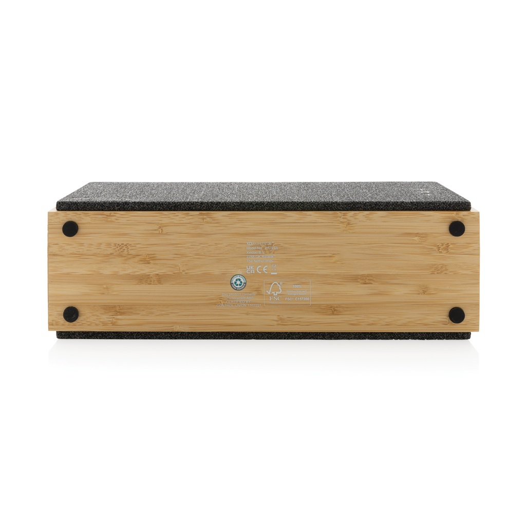 Роскошный и мощный динамик 20 Вт с чистым звуком и мощными басами. Внешний корпус изготовлен из бамбука, сертифицированного FSC на 100%. Пластиковые компоненты изготовлены из переработанного АБС-пластика, сертифицированного по стандарту RCS (Recycled Claim Standard). Общее содержание переработанных материалов: 17 % от общего веса изделия. Сертификация RCS гарантирует полностью сертифицированную цепочку поставок переработанных материалов. Динамик оснащен BT 5.1 для легкой и плавной работы на расстоянии до 10 метров и низкого энергопотребления. Аккумулятор емкостью 1200 мАч обеспечивает до 6 часов воспроизведения и может быть полностью перезаряжен за 3 часа. С функцией подхвата и микрофоном для ответа на (видео) звонки. Упакован в коробку из крафт-бумаги FSC mix. Включает сертифицированный RCS переработанный кабель для зарядки TPE.
