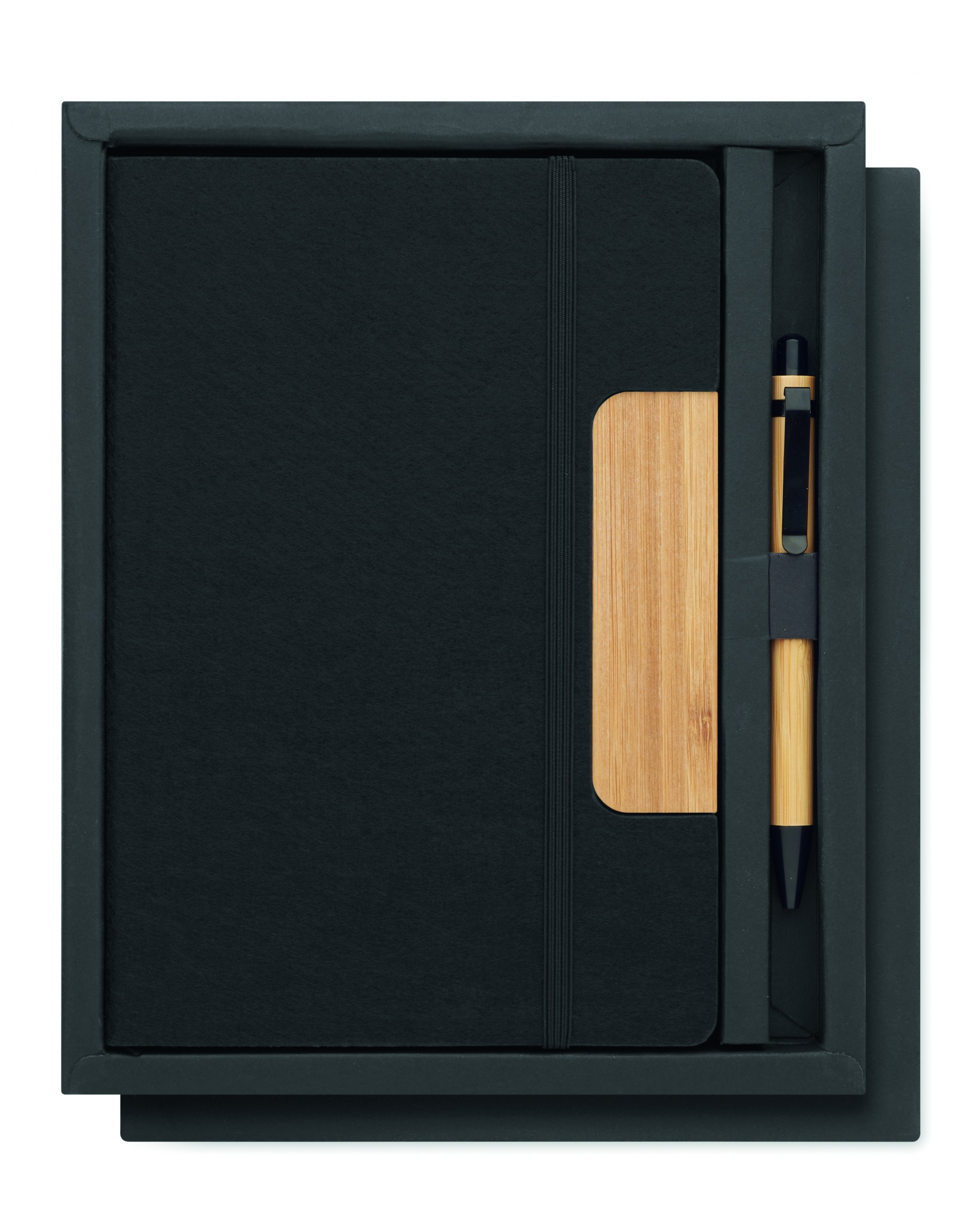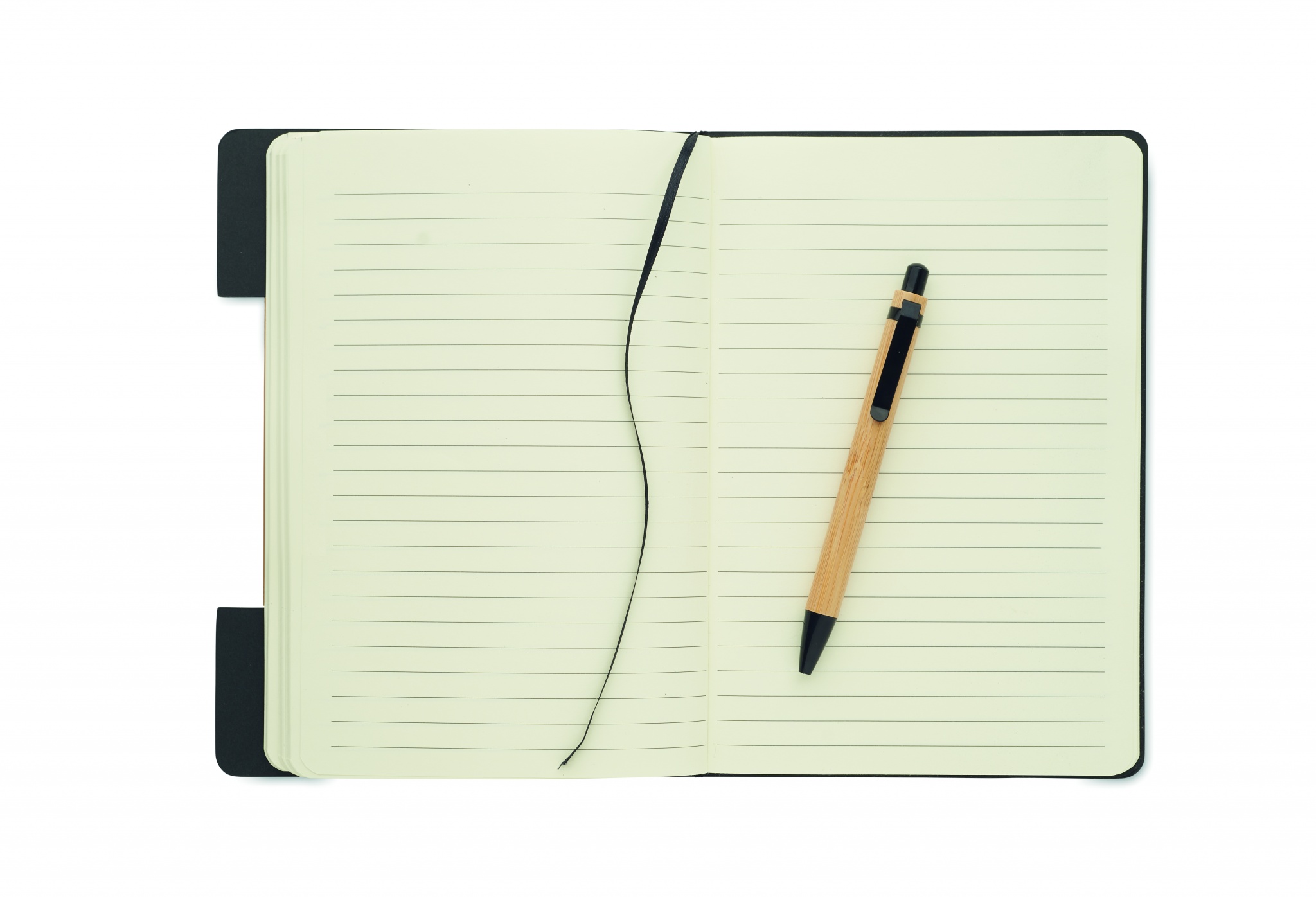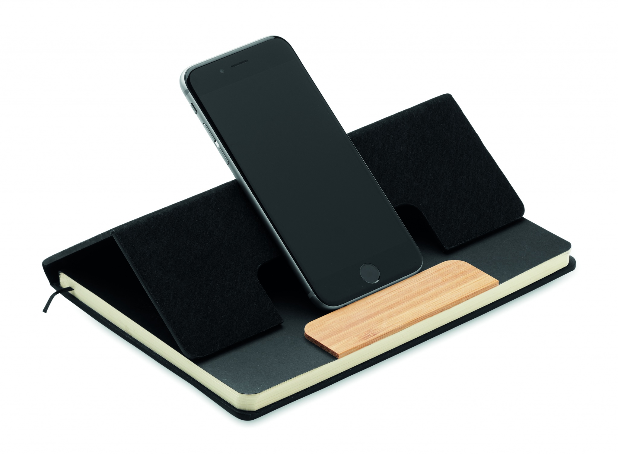Блокнот А5 в твердой обложке RPET с подставкой для телефона и бамбуковой шариковой ручкой. В переплете. 160 линованных страниц из переработанной бумаги (80 листов). Эластичный ремешок. Закладка-лента. Синие чернила.