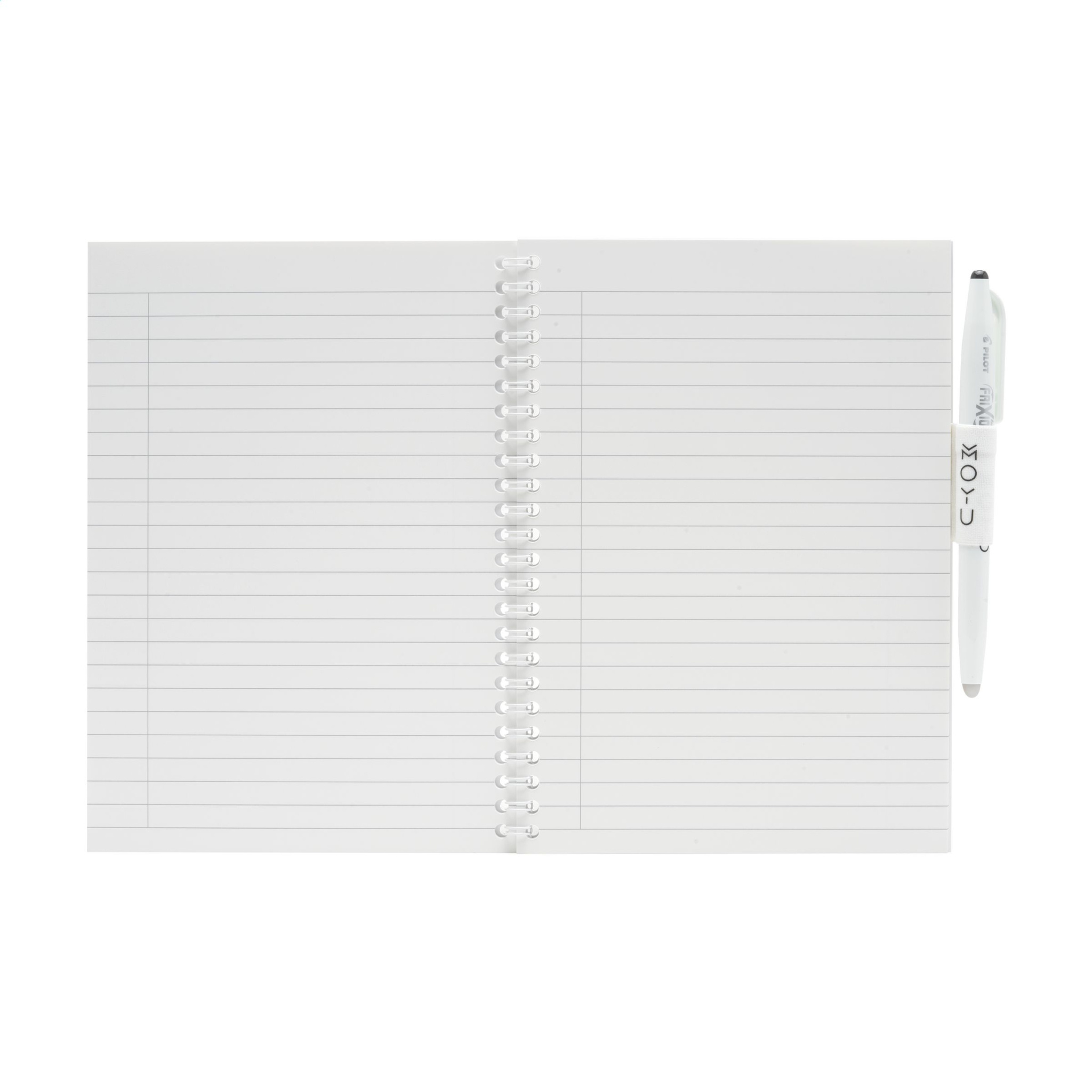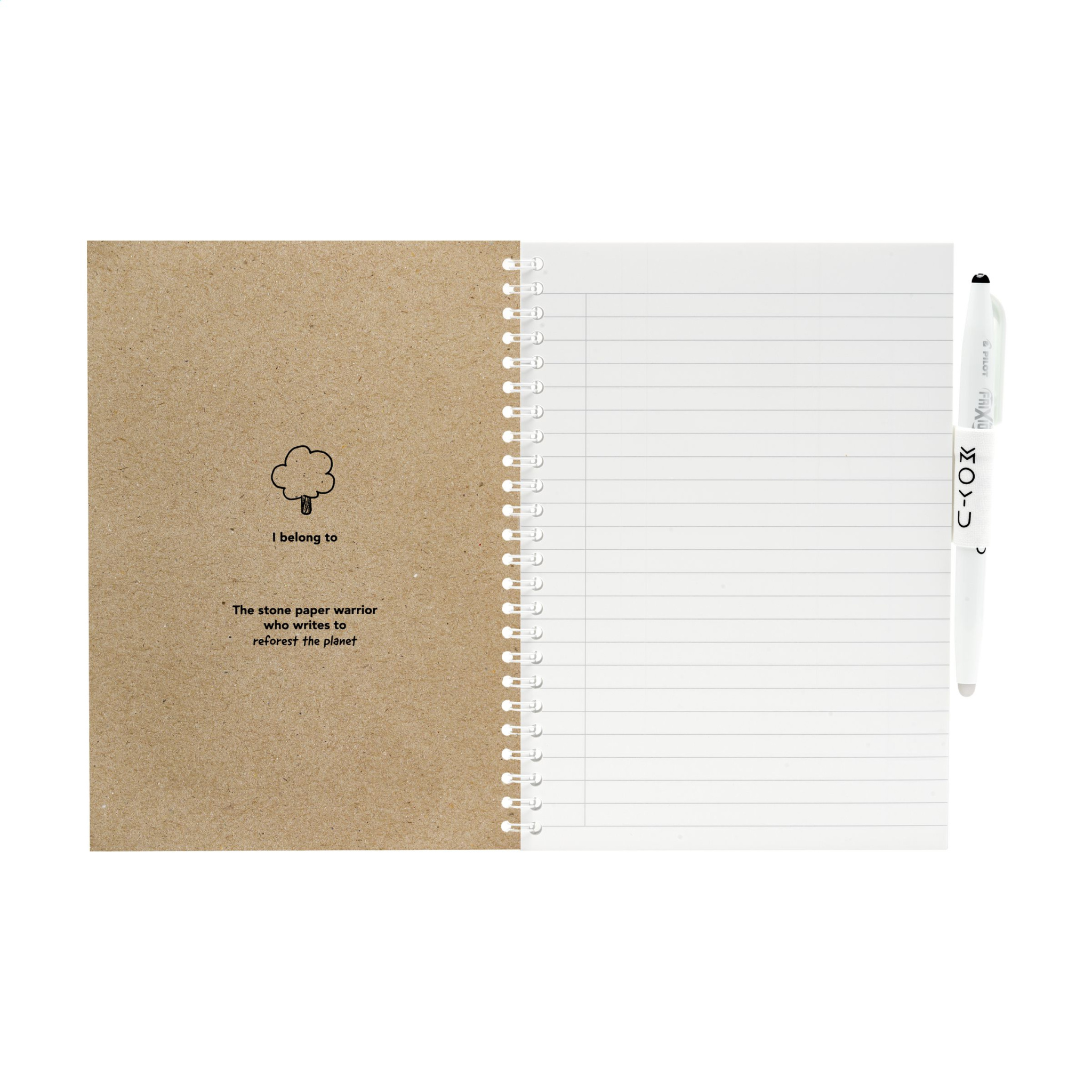 Стираемый блокнот формата A5 под брендом MOYU из каменной бумаги. Прочная обложка изготовлена из 440 граммов переработанного крафт-картона. В комплект входят ручка и салфетка для протирки. Каждая страница каменной бумаги производится экологически чистым способом, не содержит деревьев и на 100% пригодна для вторичной переработки. Этот блокнот с эластичной петлей для ручки имеет прочный переплет wire-o и содержит 18 страниц линованной бумаги. Делайте заметки с помощью прилагаемой специальной ручки MOYU. Эта ручка содержит оригинальные чернила Frixion. Эти специальные чернила полностью высыхают на каменной бумаге и легко стираются, не оставляя следов. Слегка смочите прилагаемую салфетку MOYU водой и сотрите чернила. Таким образом, страницы останутся пустыми для новых идей и списков дел. В среднем вы можете писать на каменной бумаге 500 раз. Этот блокнот прослужит вам долгие годы. Каменная бумага изготовлена из 80% известняка и 20% чистого пластика. Она естественным образом не содержит деревьев, и для ее изготовления не требуется вода или химикаты. Производство каменной бумаги, таким образом, более экономично и производит на 67% меньше CO2, чем производство целлюлозной бумаги. Кроме того, каменную бумагу можно перерабатывать бесконечно, без необходимости добавления нового сырья.