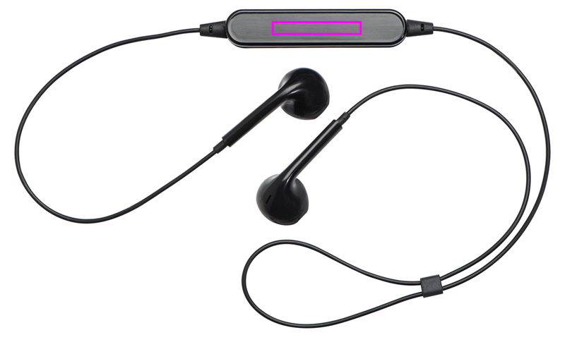 Пластиковая bluetooth-гарнитура с функцией hands-free и регулировкой громкости, USB-кабель для зарядки в комплекте. Ваш логотип будет напечатан на регулировке громкости.