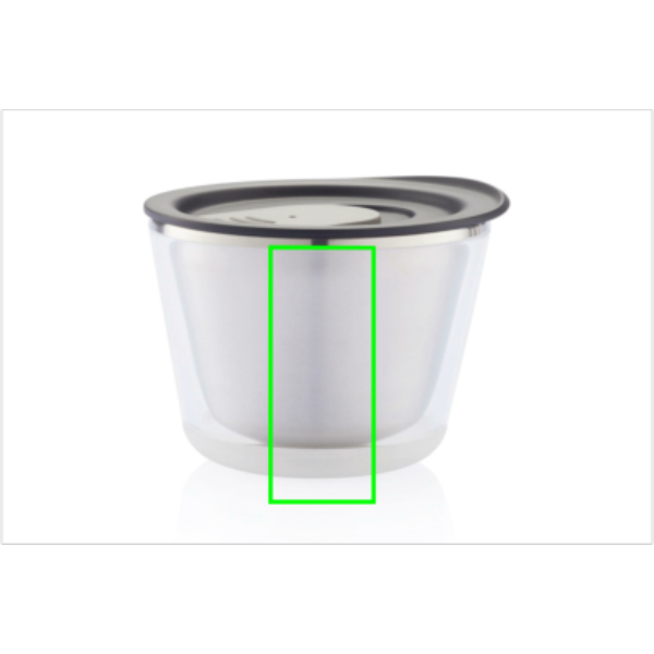 Закрывающаяся, изолированная и достаточно компактная, чтобы поместиться под кофемашиной (227 мл). Она также очень гигиенична, поскольку внутренняя часть кружки сделана из нержавеющей стали, а не из пластика. Разработана таким образом, чтобы кружку было легко разобрать для переработки. Зарегистрированный дизайн®