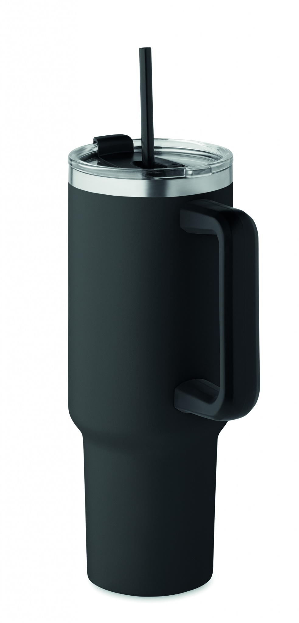 Стакан из переработанной нержавеющей стали с двойными стенками (90% переработанной нержавеющей стали и 10% нержавеющей стали) с крышкой-соломинкой, включая полиэтиленовую трубочку. Емкость 1200 мл.