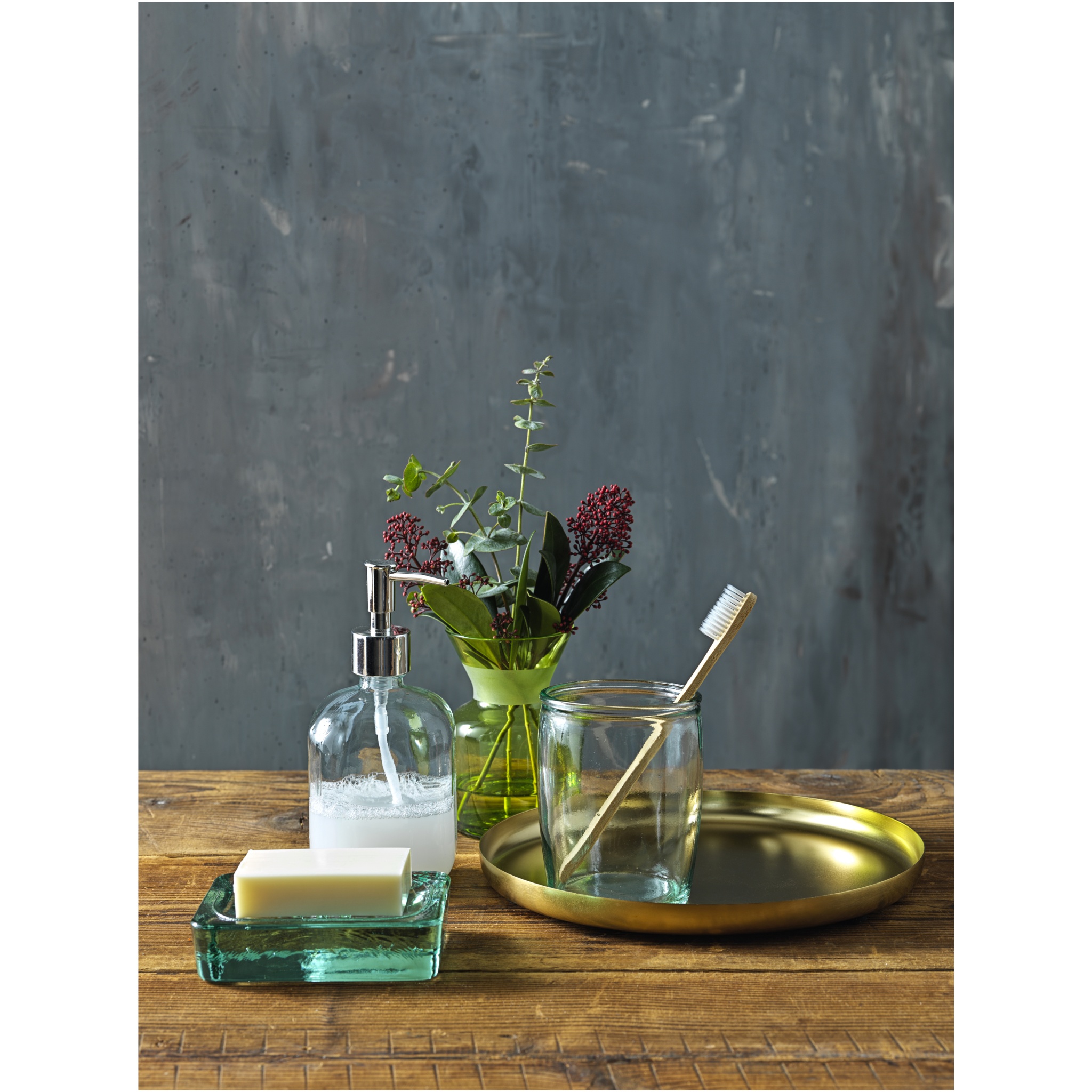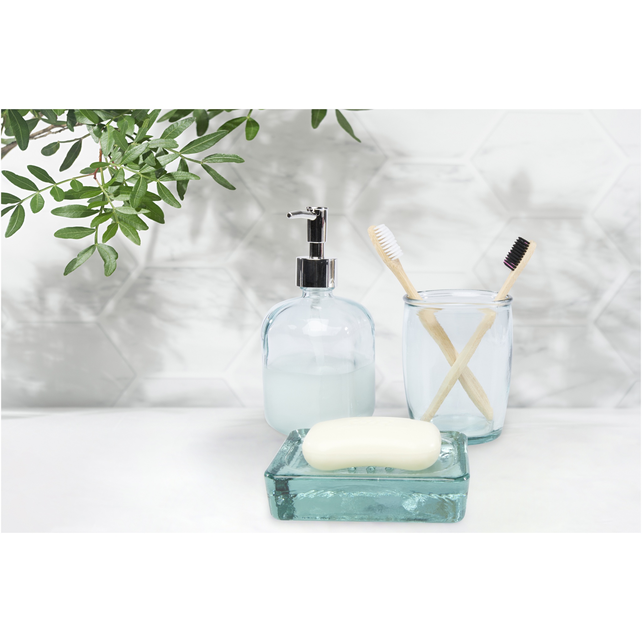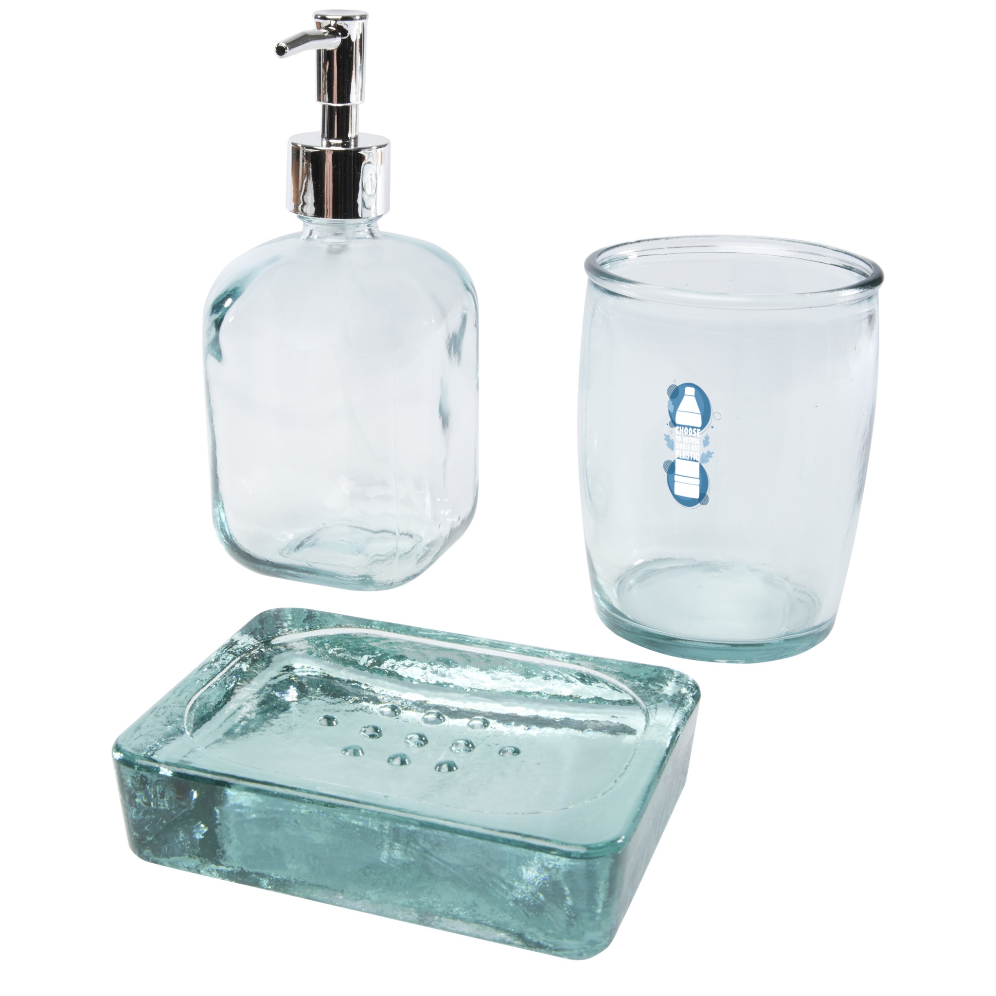 Набор для ванной из 3 предметов из 100% переработанного стекла, в который входят: дозатор для мыла (450 мл), стакан (430 мл) и мыльница (13 x 10 см). На изготовление переработанного стекла затрачивается меньше энергии, сырья и добавок, чем на изготовление традиционного стекла. Можно мыть в посудомоечной машине.