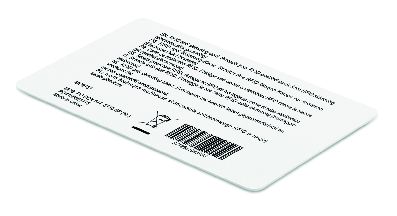 Карта защитная RFID. Электромагнитное поле всех карт - 13,56 МГц (поезда, автобусы, банковские или кредитные карты) . Используя эту защитную карту, такие карты становятся не считываемыми на расстоянии 2-3 см и защищены от утечки информации. (0,9 mm).