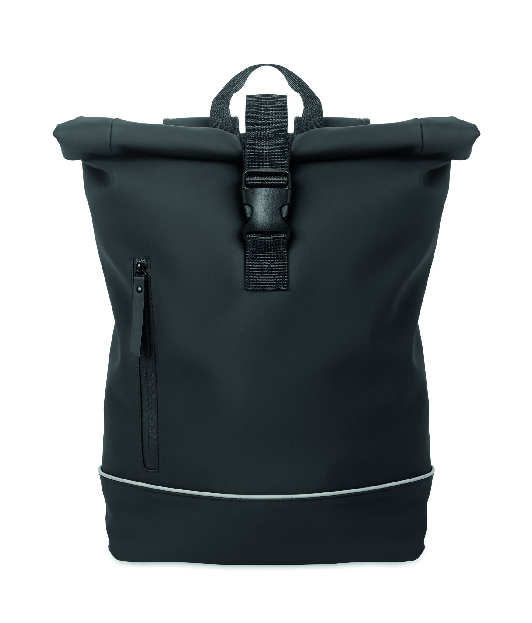 15 inch roll top laptop backpack in soft PU with padded back and base reinforcement with reflective strip. Waterproof zippered front pocket. 210D RPET polyester lining.