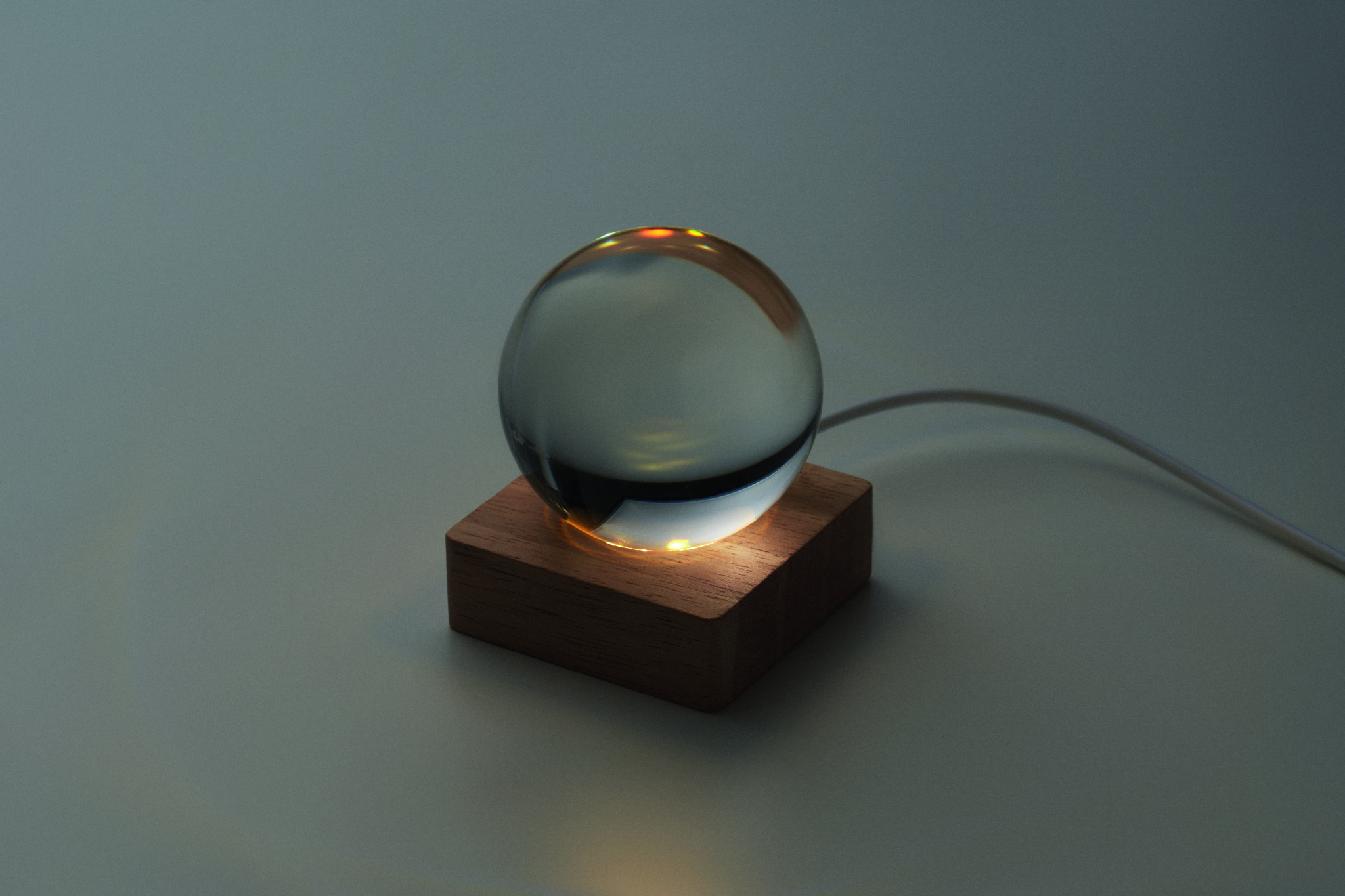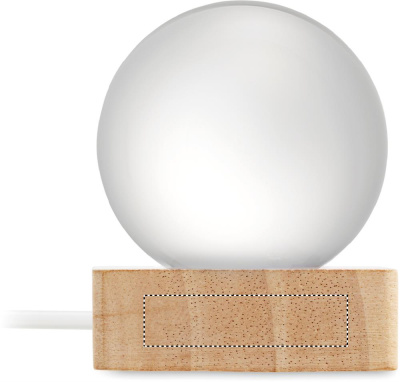 Glass ball with LED light (100 lumens) on a rubber wood base. Includes a USB charging cable (90 cm).