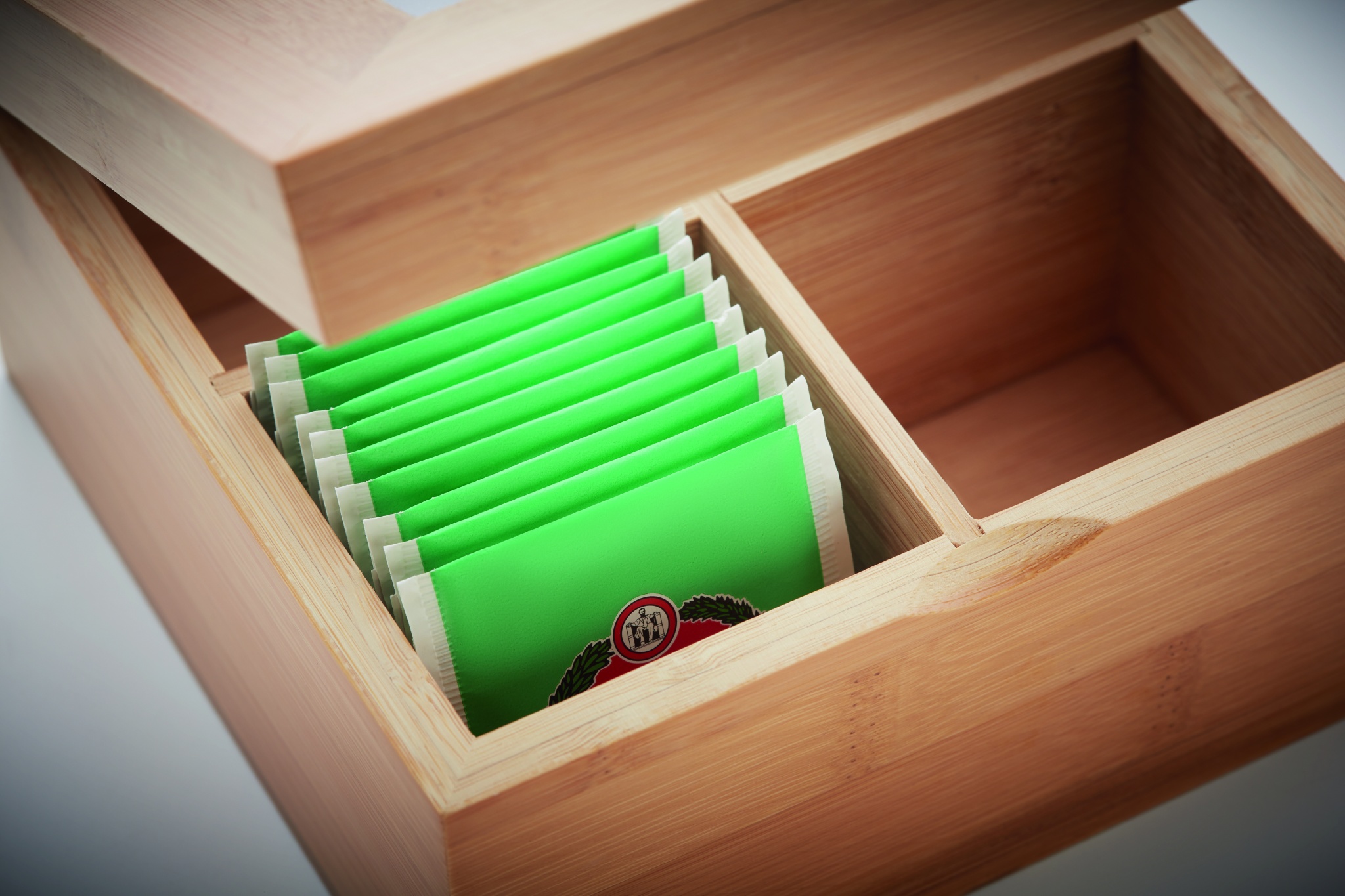 Коробка для чая из бамбука с прозрачной стеклянной крышкой. В четырех отсеках вы можете легко хранить 24 чайных пакетика. Так как бамбук является натуральным материалом, у отдельных изделий могут быть небольшие различия в цвете и размере