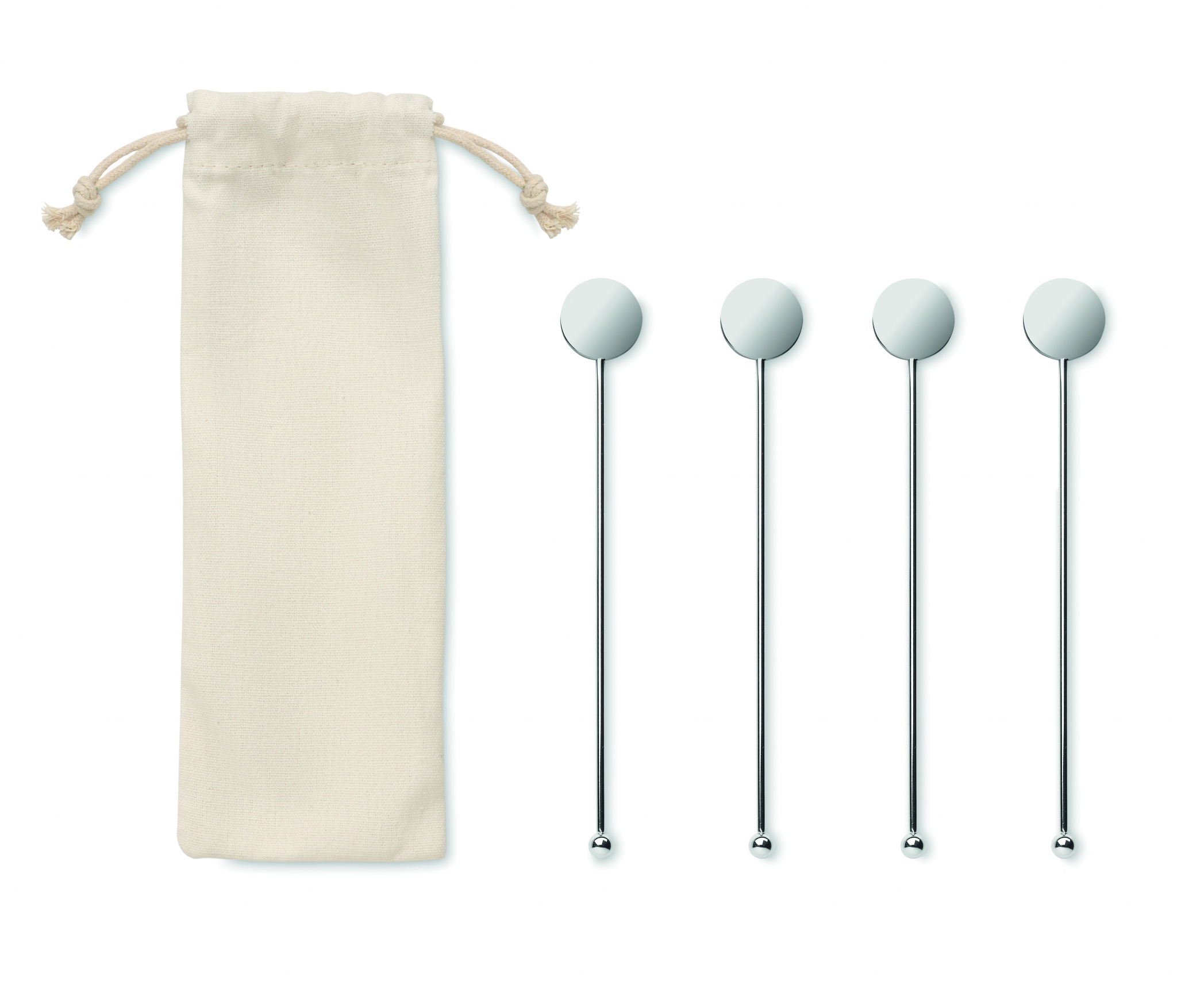 Набор из 4 размешивателей для напитков из нержавеющей стали в хлопковом мешочке на шнурке.