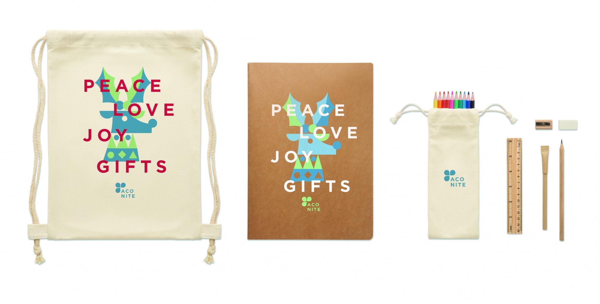 Набор для рисования и канцелярские принадлежности из 5 предметов, включающие деревянную линейку, деревянную точилку, ластик, деревянный карандаш и картонную шариковую ручку. Дополнительно 10 карандашей для раскрашивания, бумага A4 из вторсырья 50 листов (100 страниц). Поставляется в хлопковом мешочке с завязками.