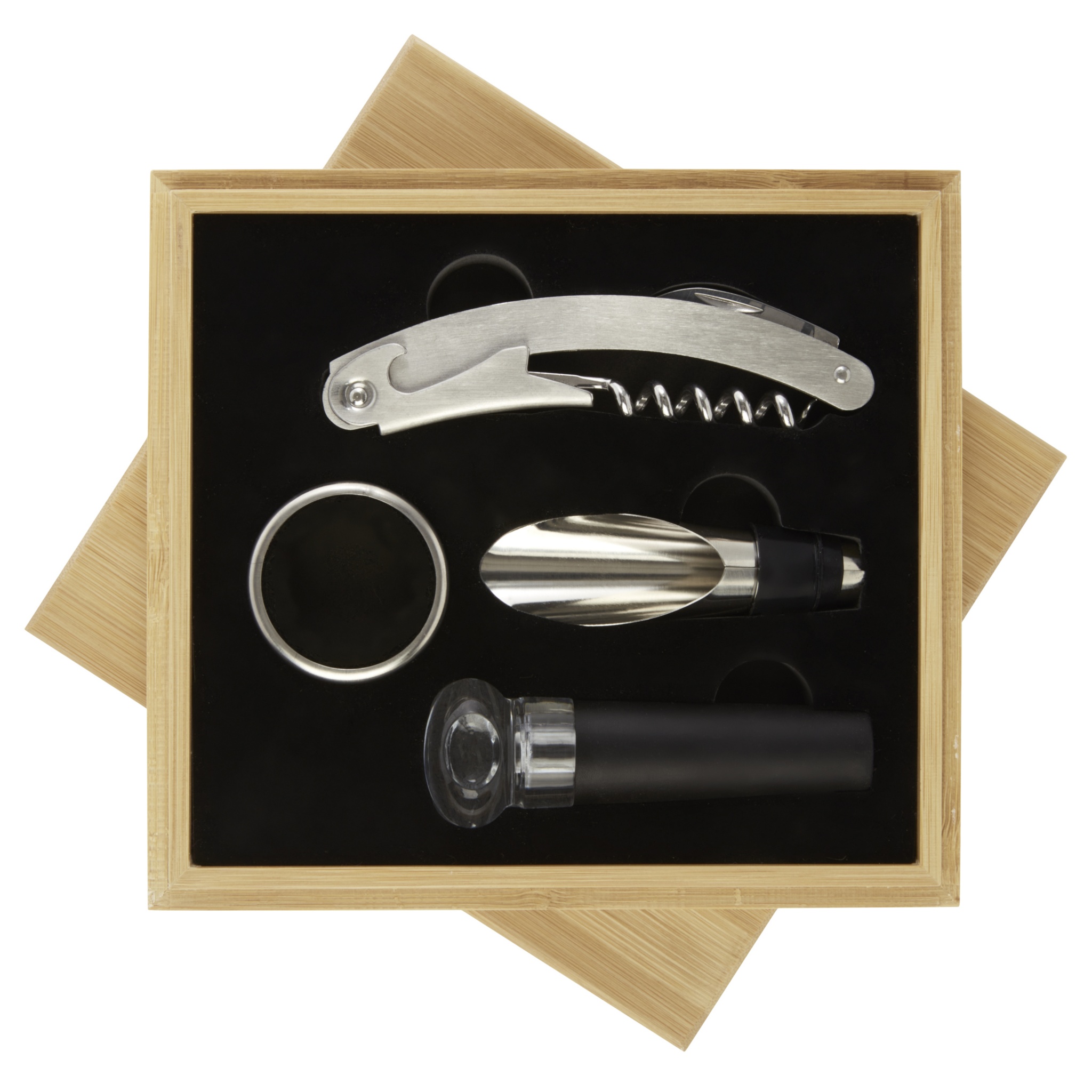 Набор для вина из 4 предметов: штопор официантки, пробка, насадка на бутылку и кольцо. Поставляется в бамбуковой подарочной коробке, изготовленной в соответствии с экологическими стандартами.