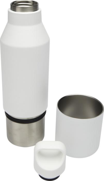 Бутылка из нержавеющей стали с двойными стенками и медной изоляцией, сертифицированная согласно RCS, со съемной крышкой. Эта многофункциональная бутылка помещается в боковой карман рюкзака и имеет удобную ручку для переноски, встроенную в крышку. Прочное порошковое покрытие снаружи. Напитки останутся горячими в течение 12 часов и холодными в течение 24 часов. Поставляется в подарочной коробке из переработанного картона. Объем бутылки: 600 мл. Объем кружки: 300 мл.