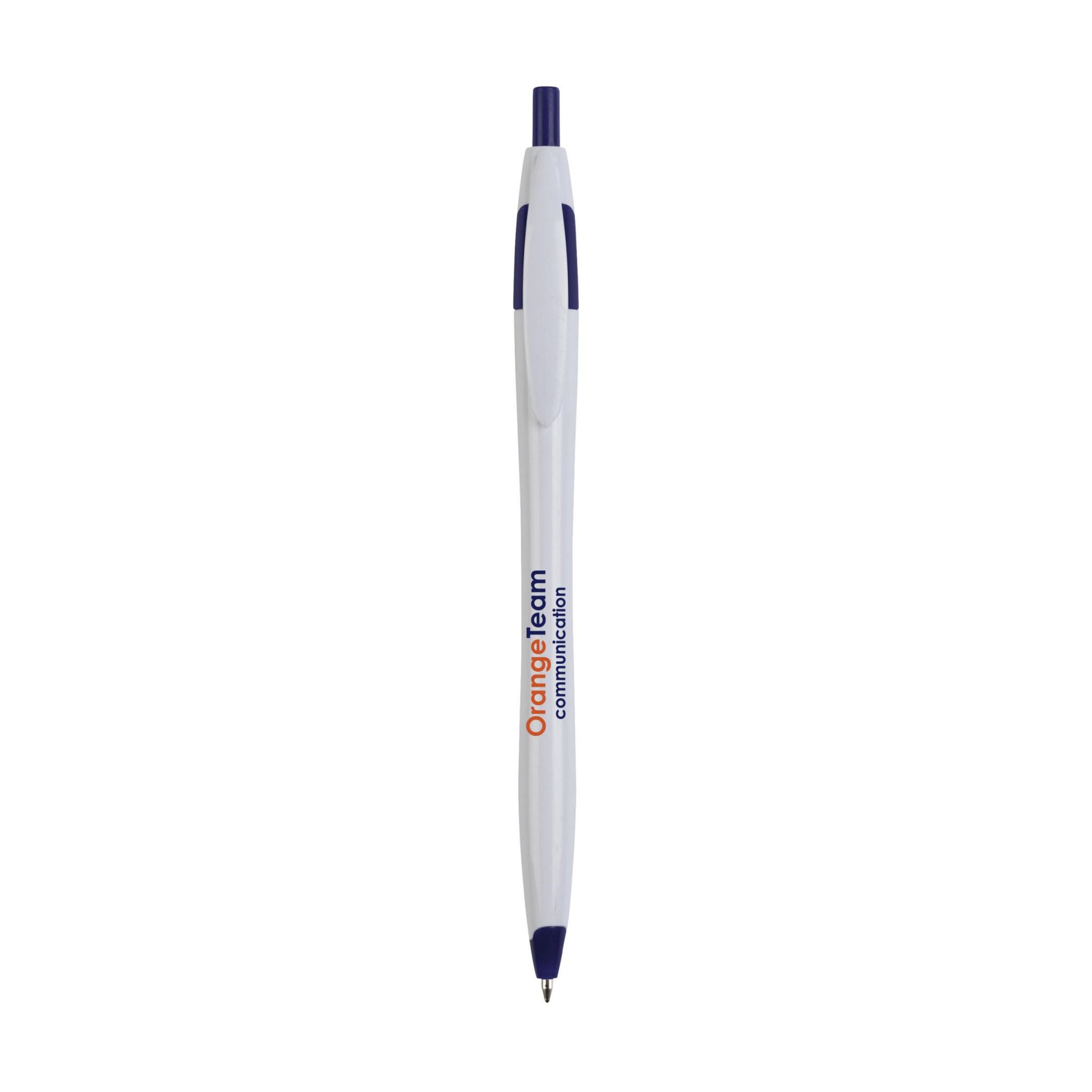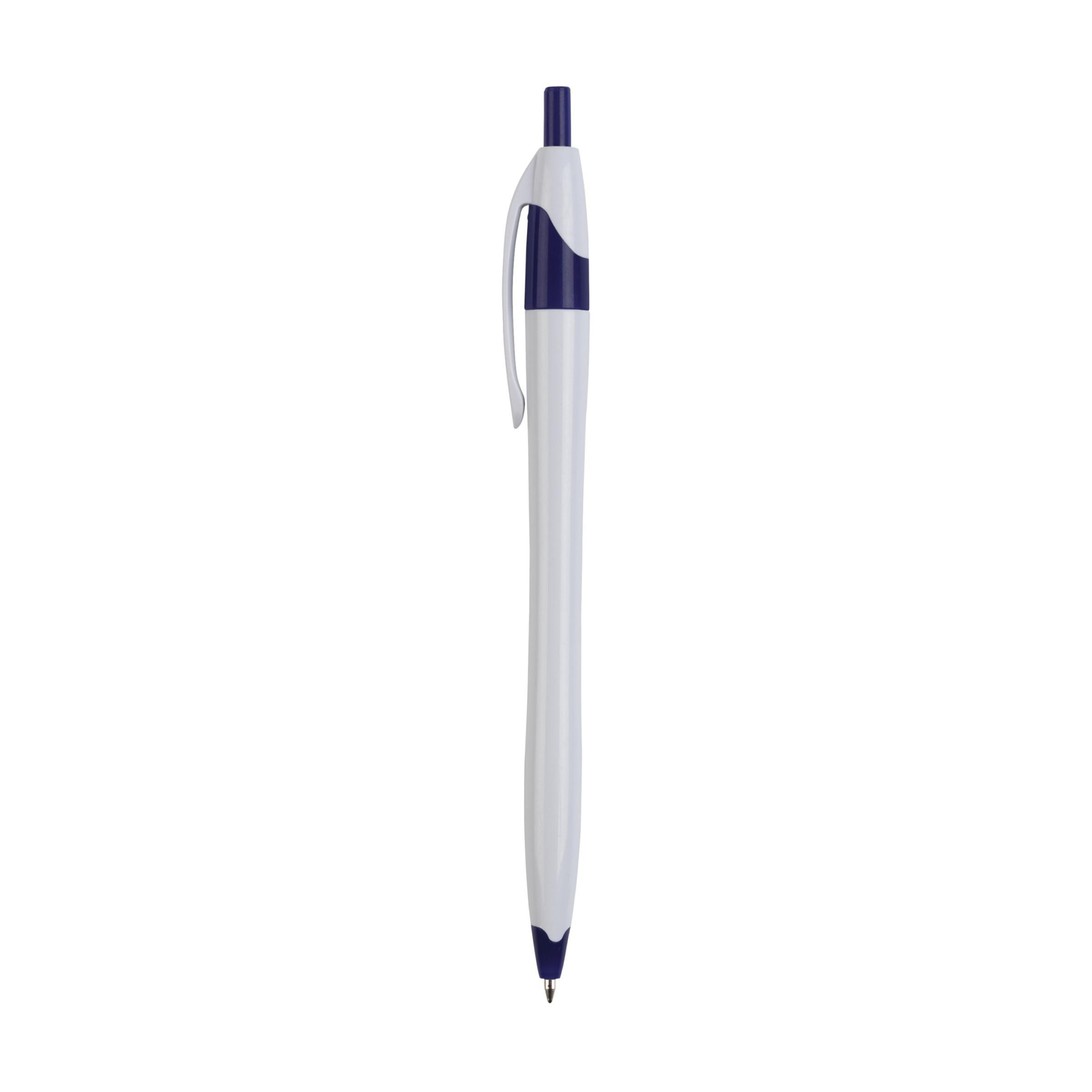 Шариковая ручка с синими чернилами, цветными акцентами и обтекаемым корпусом.