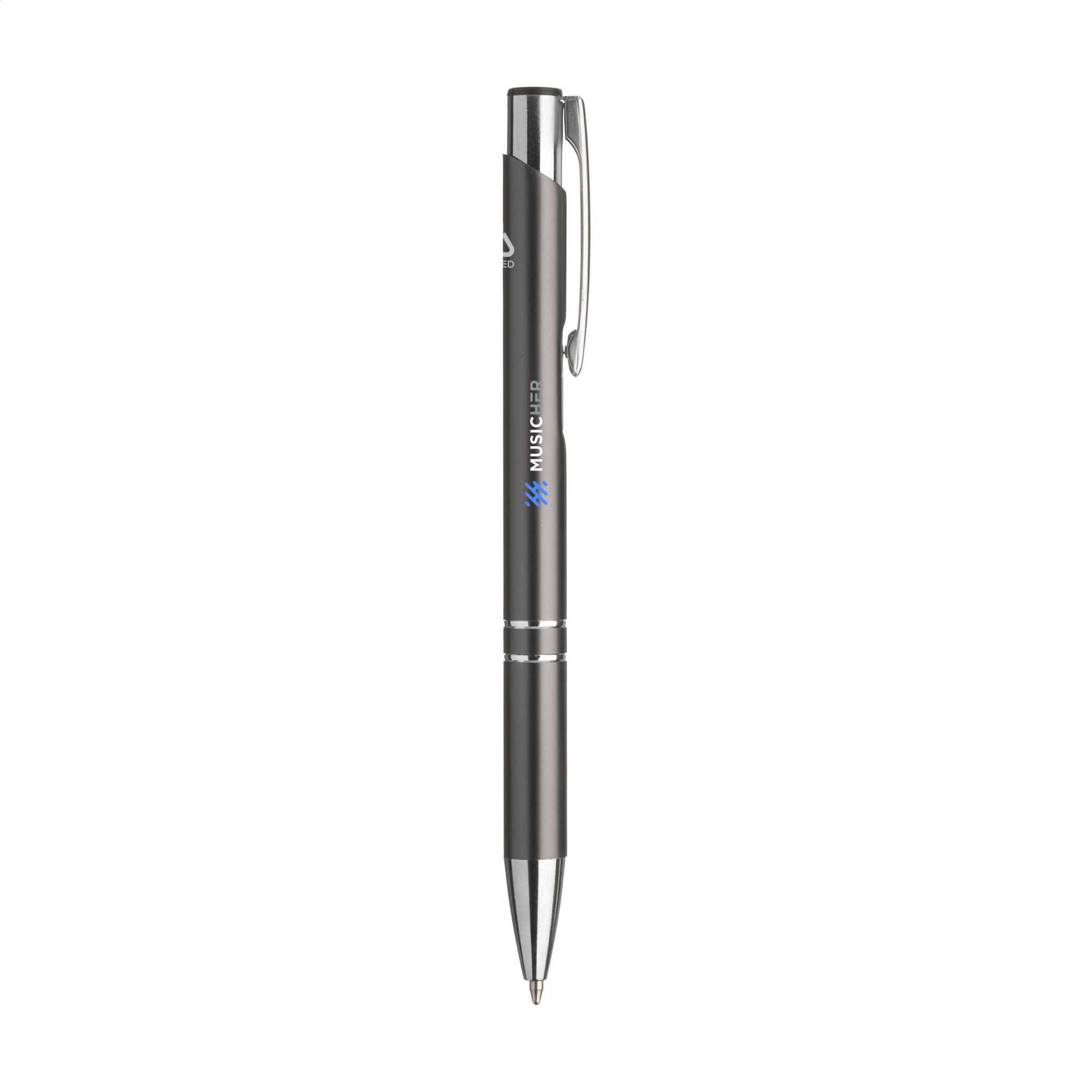 WoW! Шариковая ручка с синими чернилами, изготовленная из переработанного алюминия. Корпус отделан красивой глянцевой металлической отделкой и снабжен металлическим зажимом. Благодаря использованию переработанного алюминия при производстве этого продукта используется меньше нового сырья. Это означает меньшее потребление энергии и меньшее использование воды. Ответственный выбор.