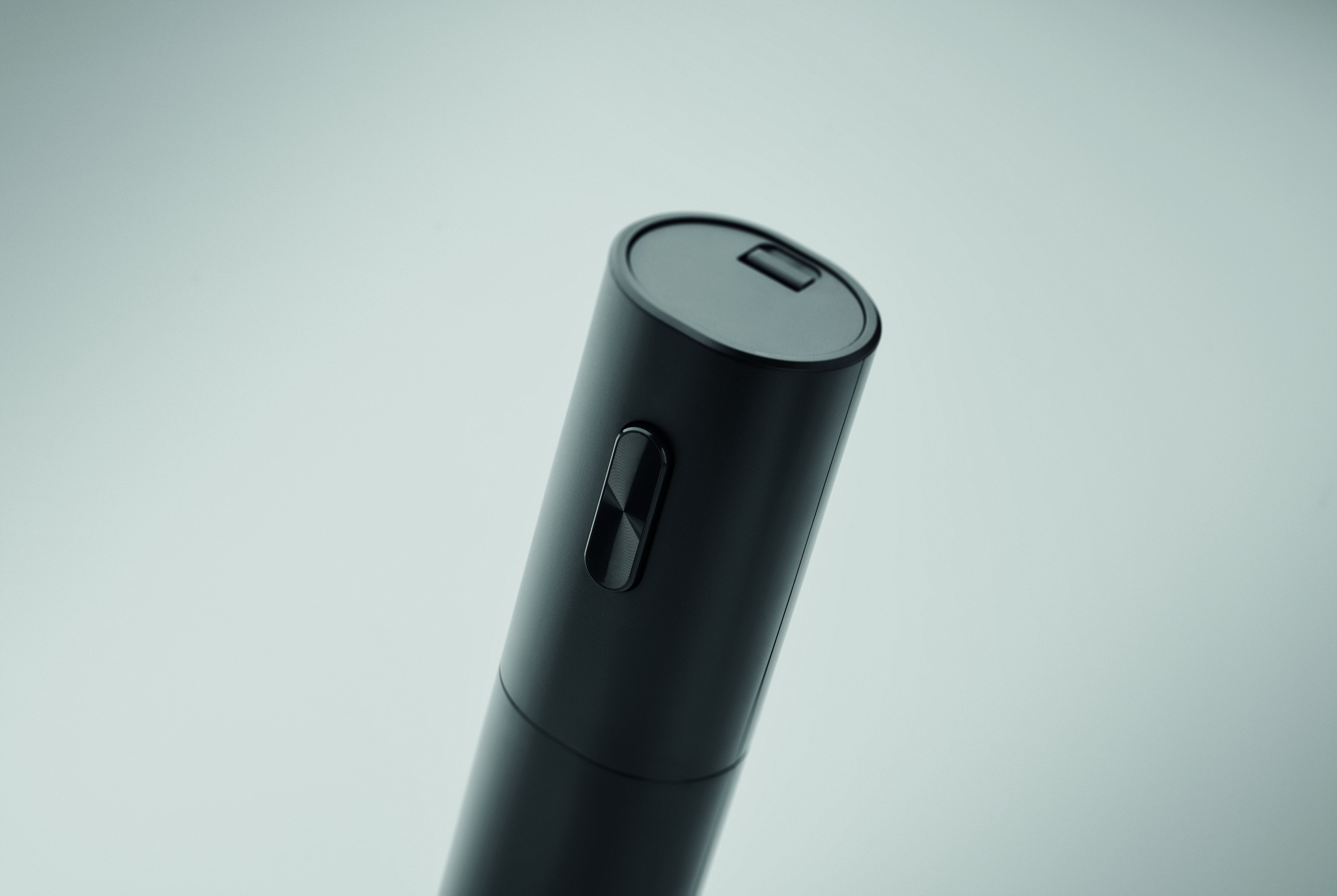 Электрический штопор в пластиковом корпусе с черной матовой отделкой. В комплекте 4 батарейки AAA.