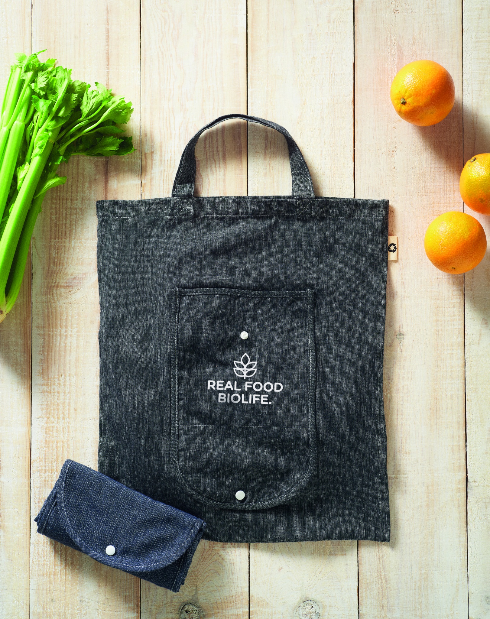 Складная двухцветная сумка для покупок из переработанного хлопка и переработанного полиэстера с длинными ручками. Приблизительно 140 гр/м². Возможна усадка после нанесения.