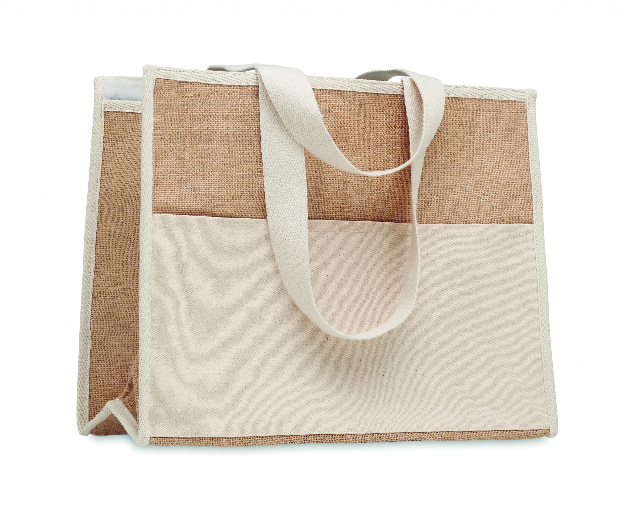 Сумка для покупок из джута с длинными ручками, ламинированная, с застежкой на петлю. Спереди холщовый карман и хлопковая тесьма.