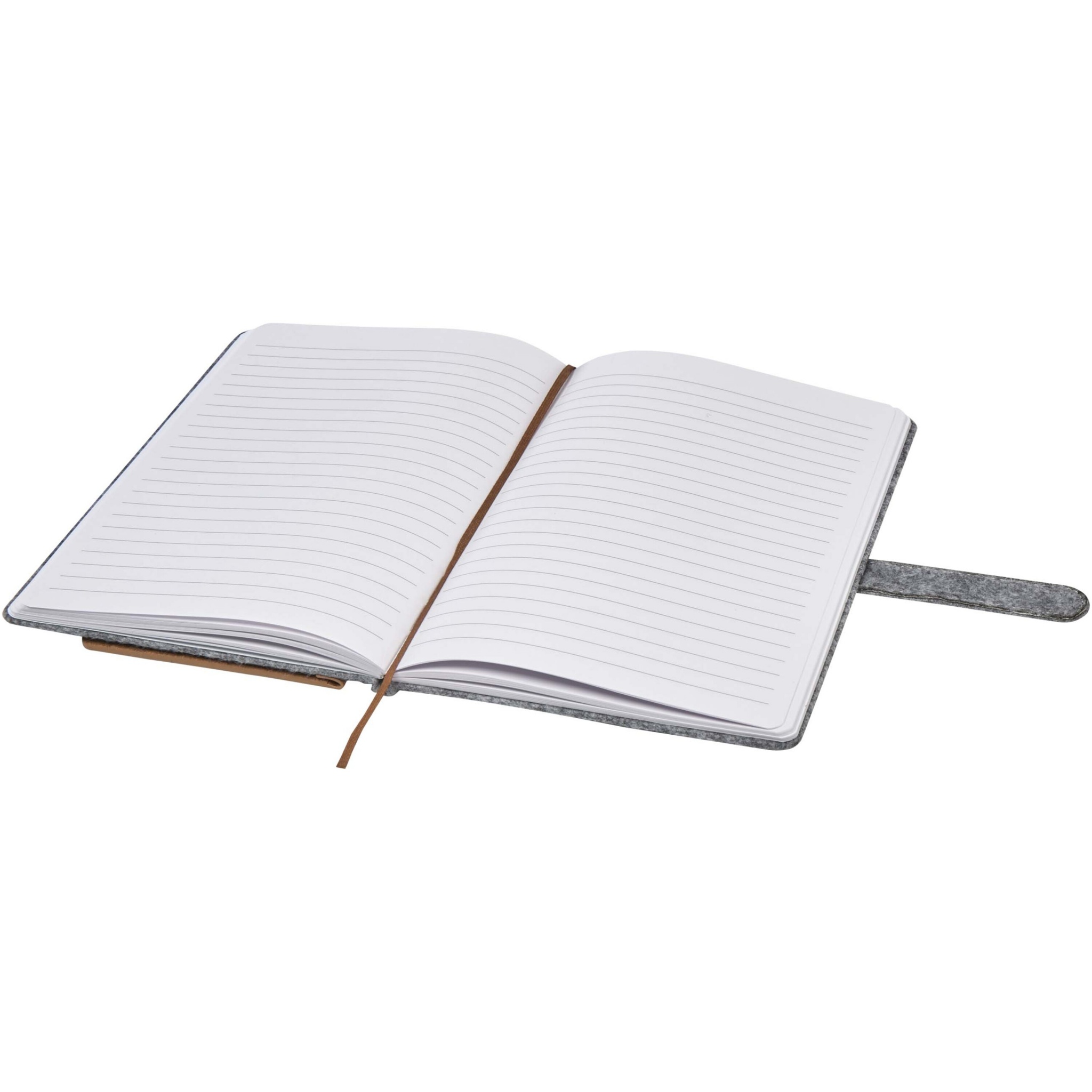 Блокнот формата А5 в твердой обложке из переработанного фетра и пробки, 80 листов бумаги плотностью 70 г/м² в линейку. Блокнот имеет 3 кармана для визиток, коричневую ленту в тон и закругленные углы.