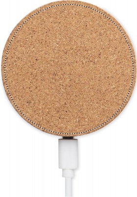 Trådlös laddare i rund form av kork. Utgång: DC 9V/1,1A (10W). Kompatibel med telefoner för QI-laddning så som Samung 7, iPhone® 8 och nyare.
