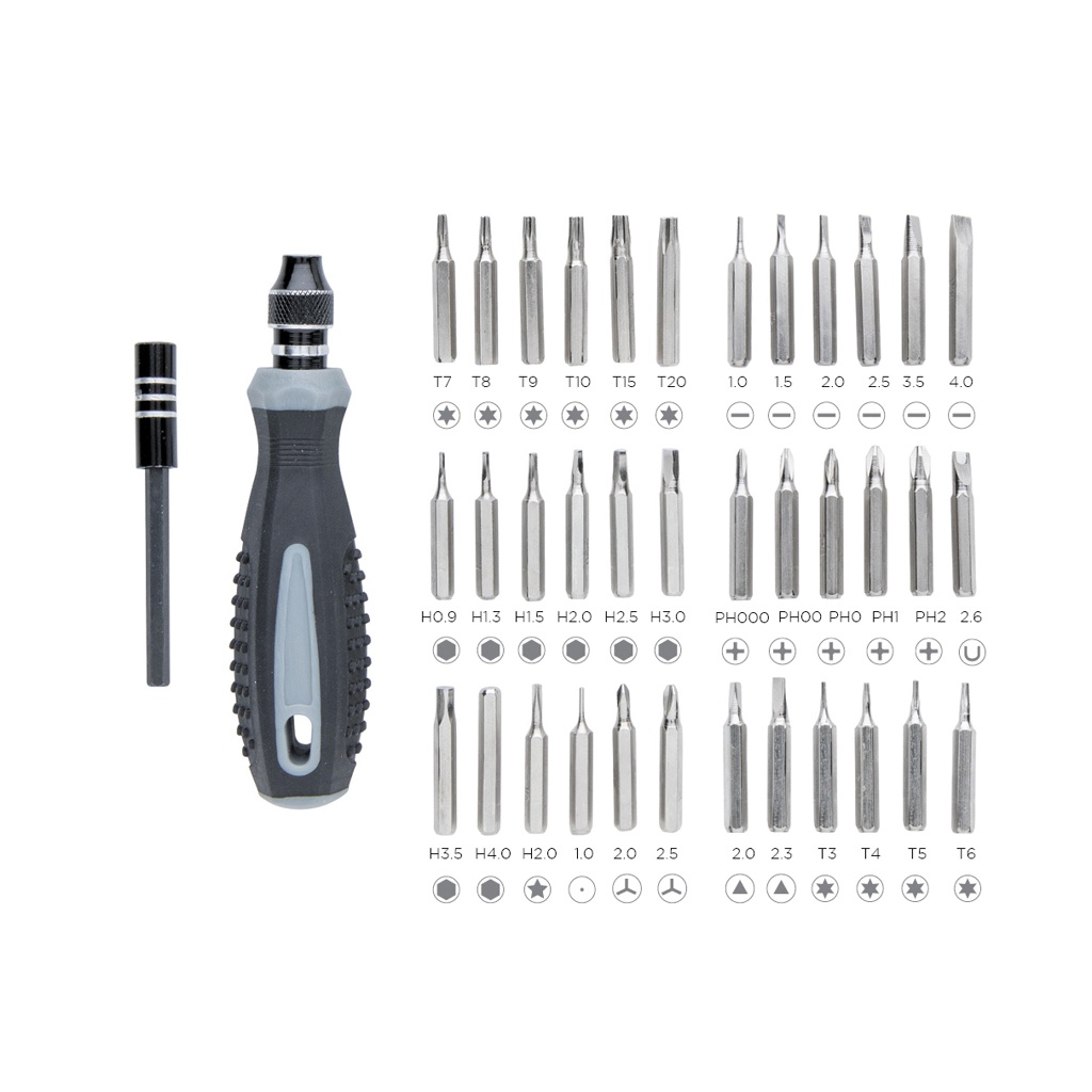 38 delar verktygsset med PP bits-hållare. Bits tillverkade av kolstål. ABS låda med transparent lock.