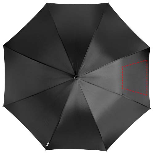 23" automatisk paraply i exklusiv design. Metallskaft, metallribbor och gummihandtag med aluminiumdetalj. Specialdesignat handtag för att hänga upp paraplyet på ett bord. Inklusive Marksman fodral.