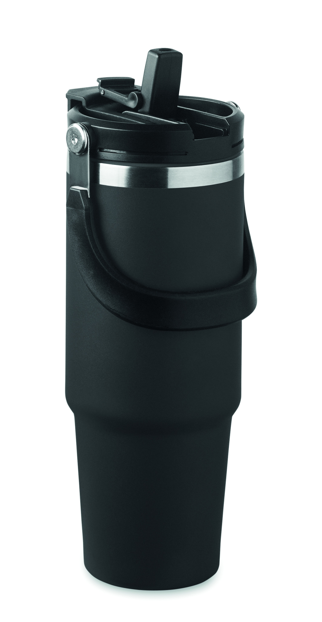 Populär dubbelväggig mugg i återvunnet rostfritt stål (90% återvunnet rostfritt stål och 10% rostfritt stål) med lock med inre sugrör, vikbart munstycke och dricksöppning. Volym 850 ml.