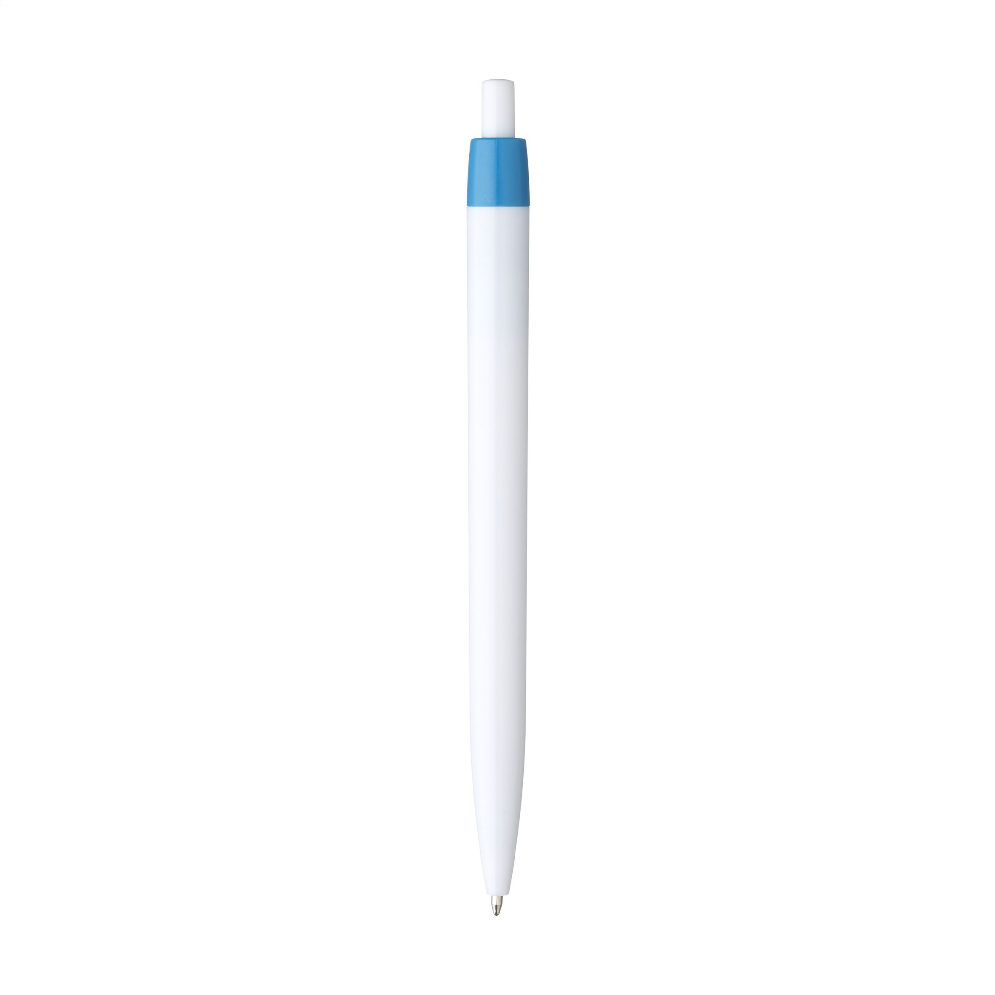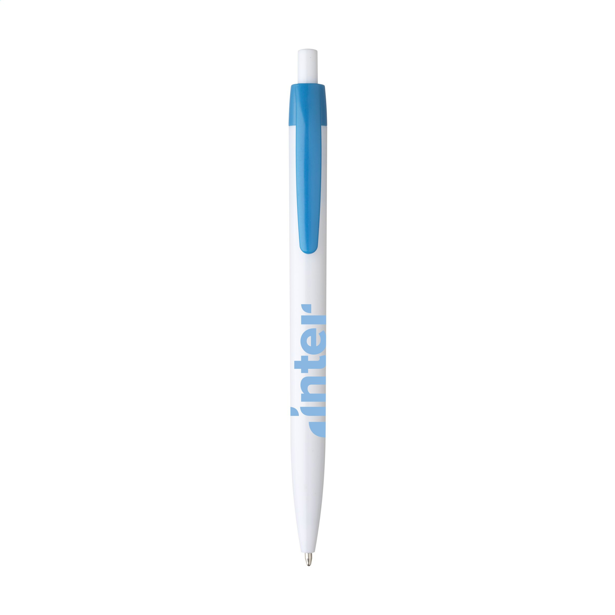 Kulspetspenna i ett stycke med blått bläck och vit tunna. Denna penna har en stor tryckyta för optimal varumärkesbyggande samt en slående, färgad klämma.