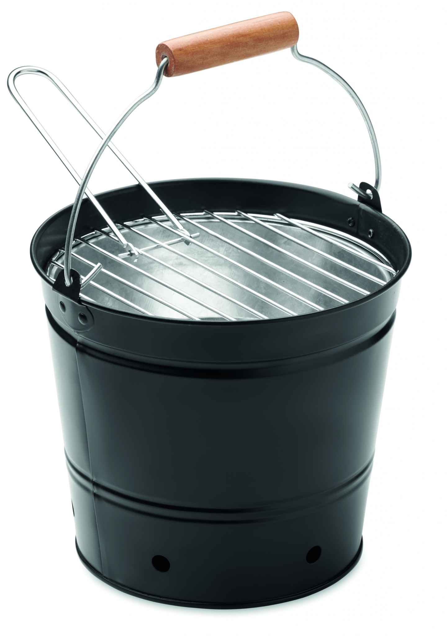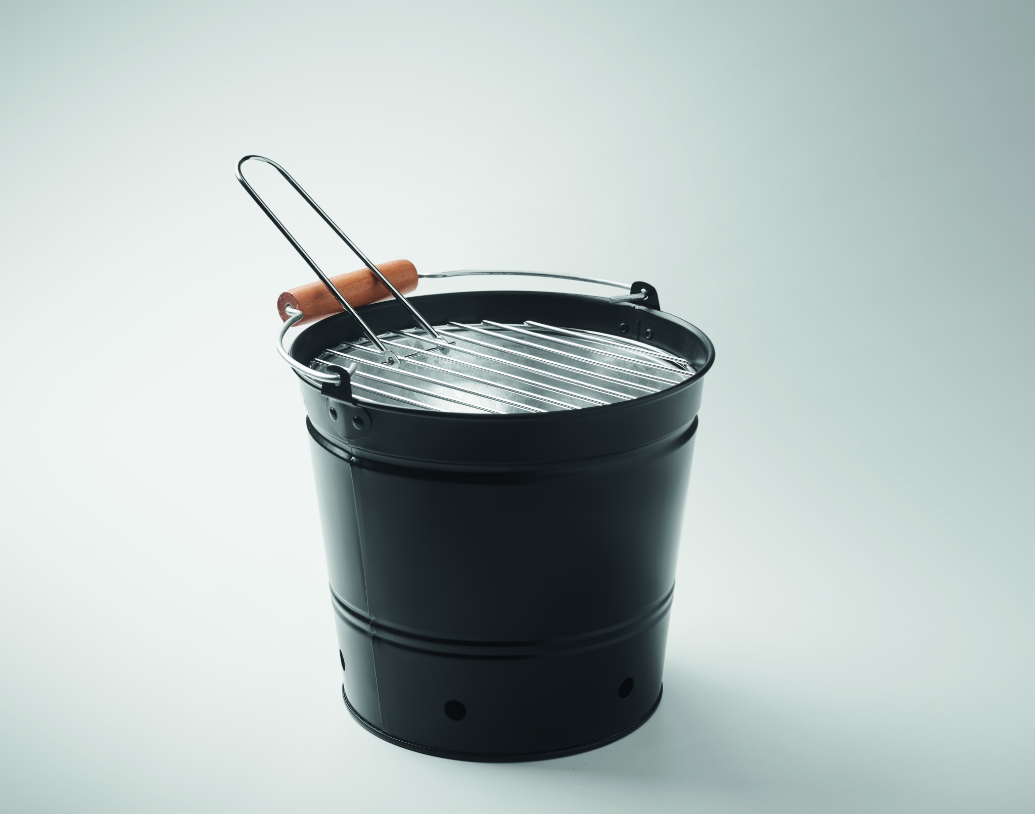 Bärbar hinkgrill i järn med grill i rostfritt stål med trähandtag.