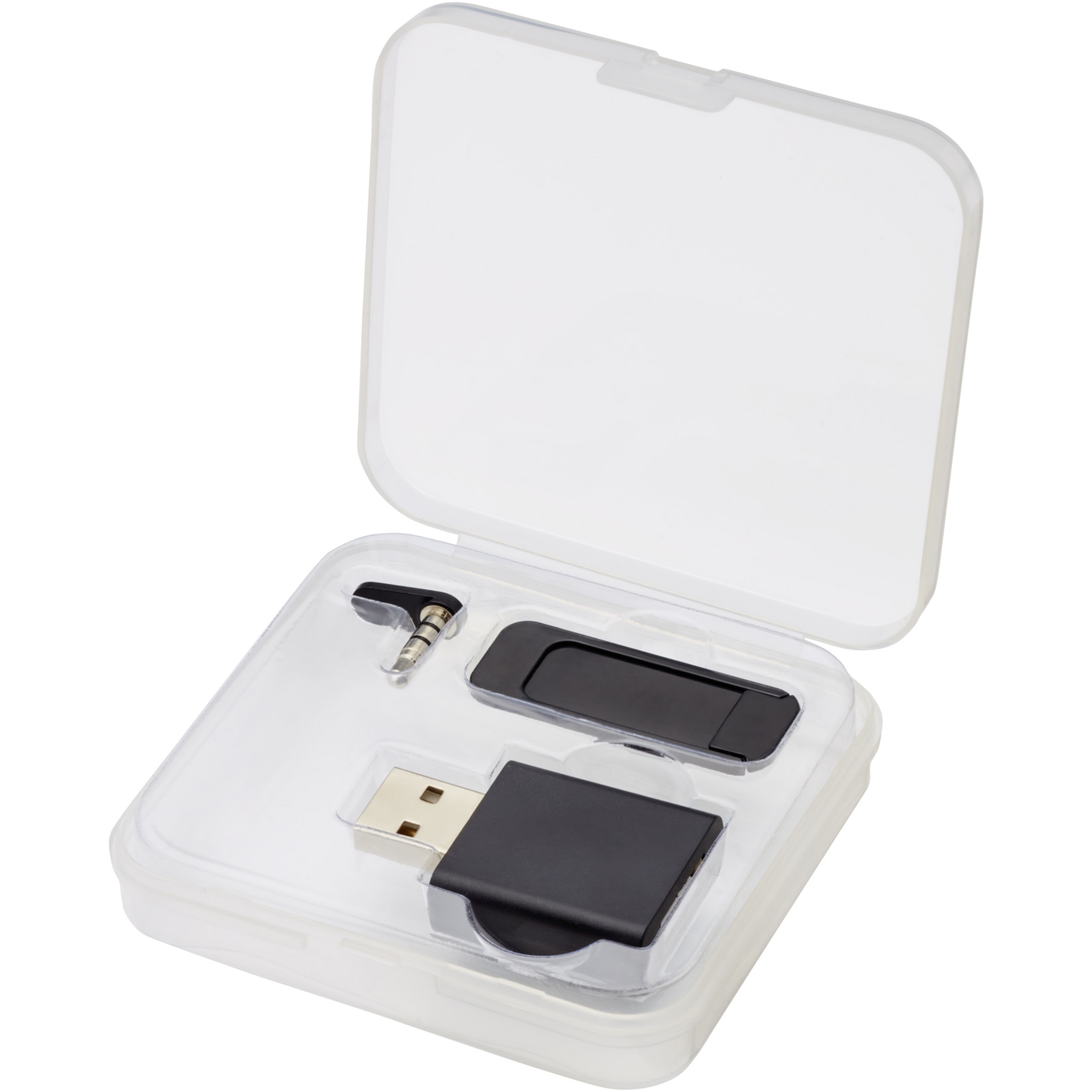 Digital integritetssats inklusive USB-datablockerare, en webbkamerablockerare och en ljuduttagsblockerare. USB-dataskyddet förhindrar oavsiktligt datautbyte när du ansluter en mobil enhet till en dator eller en offentlig laddningsstation. Objektet blockerar all datatransfer medan enheten laddas, vilket förhindrar att data stjäls eller skadlig kod installeras. Webbkamerablockeraren kan anslutas framför den bärbara webbkameran för att blockera oönskad åtkomst till webbkameran. Audiouttagsblockeraren kan placeras i AUX-porten på enheten för att undvika att tredje part lyssnar på konversationer. Levereras i ett skyddsfodral.