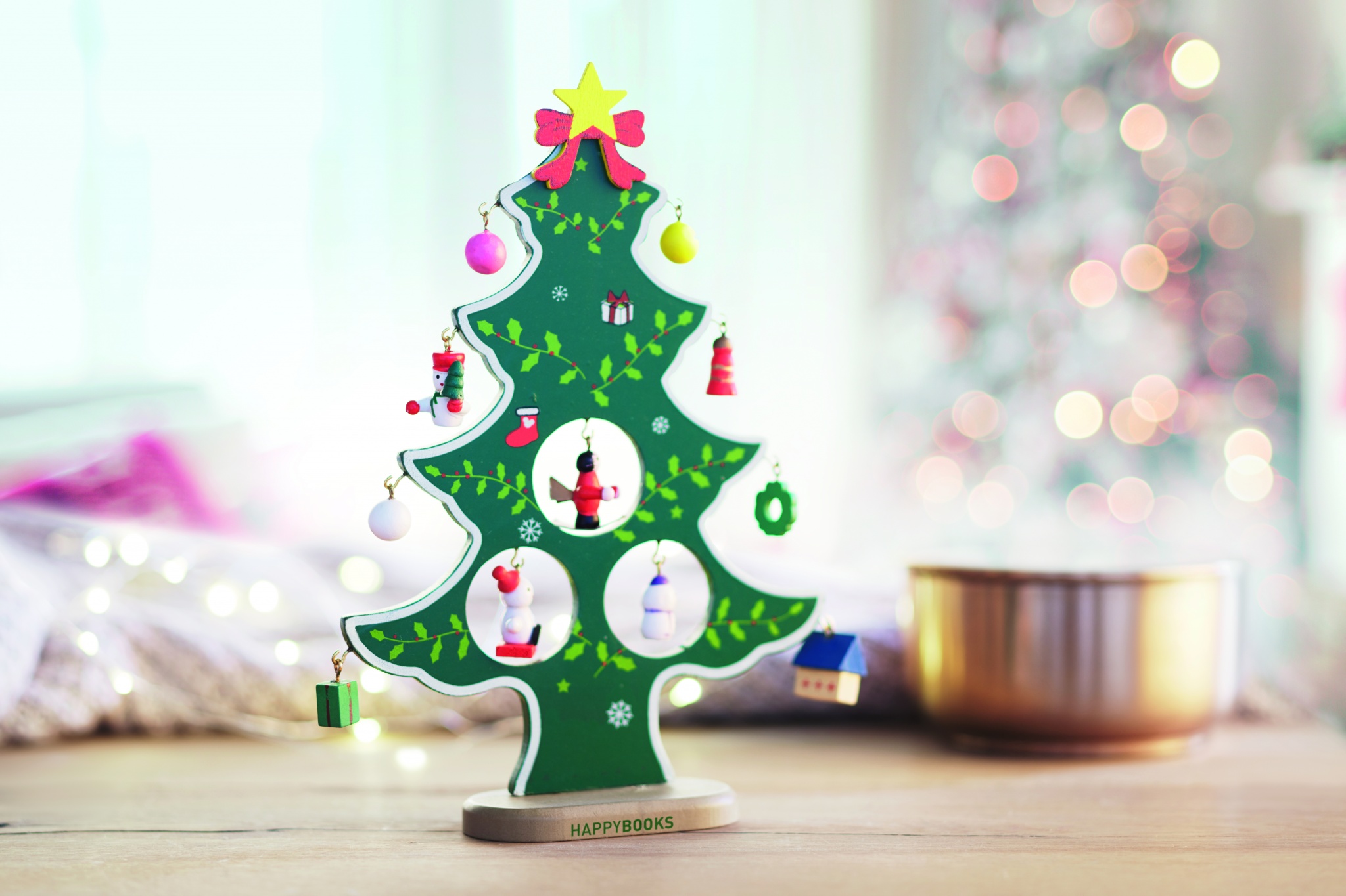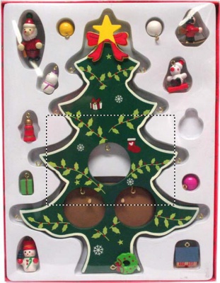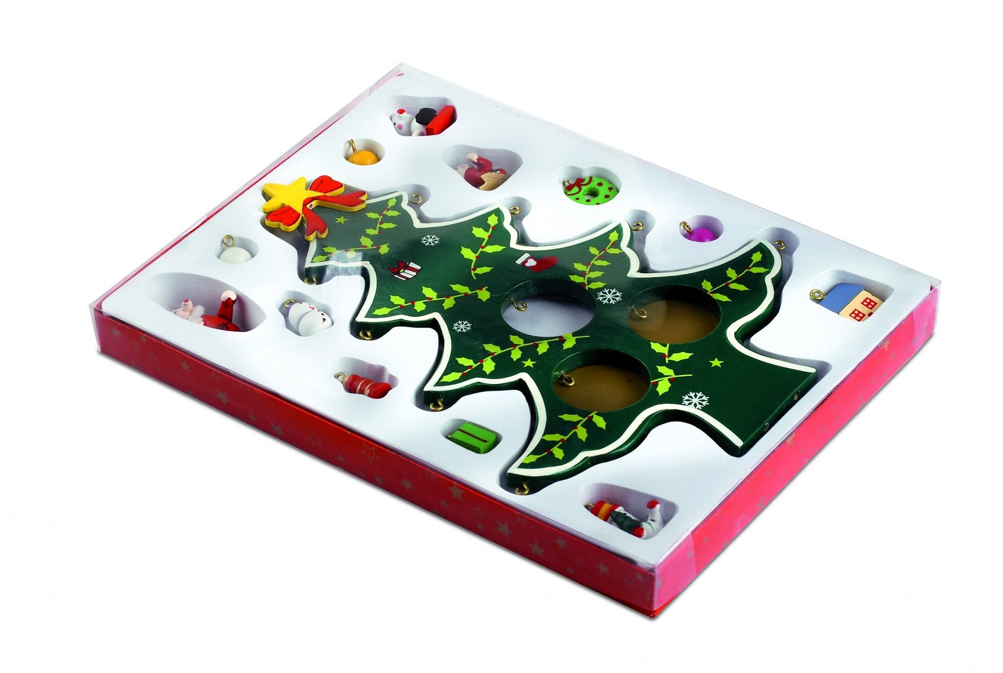 Julgran i Trä med 12 st dekorationer att pynta granen med. Levereras i presentförpackning med genomskinligt lock.